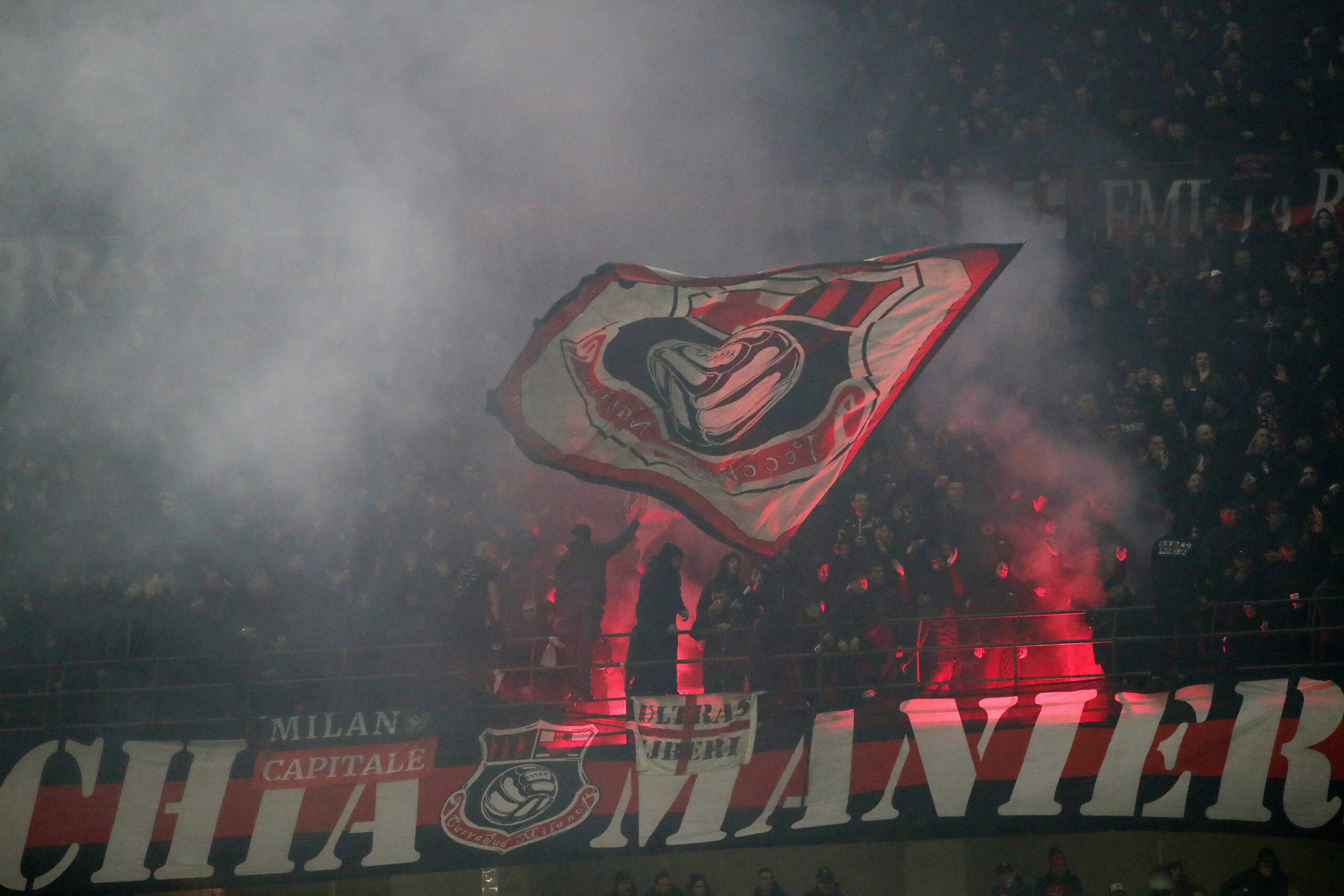 MILAN, ITALY - APRIL 22: Fans let off flares in the crowd during the Serie A TIM match between AC Milan and FC Internazionale at Stadio Giuseppe Meazza on April 22, 2024 in Milan, Italy. (Photo by Marco Luzzani/Getty Images)