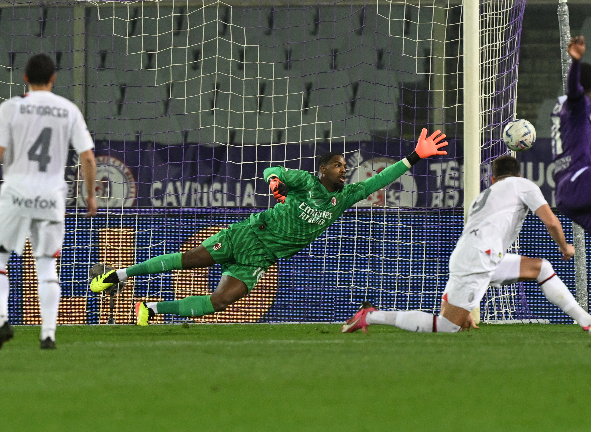 FLORENCE, ITALY - MARCH 30: Mike Maignan of AC Milan in action during the Serie A TIM match between ACF Fiorentina and AC Milan at Stadio Artemio Franchi on March 30, 2024 in Florence, Italy. (Photo by Claudio Villa/AC Milan via Getty Images) (Photo by Claudio Villa/AC Milan via Getty Images)