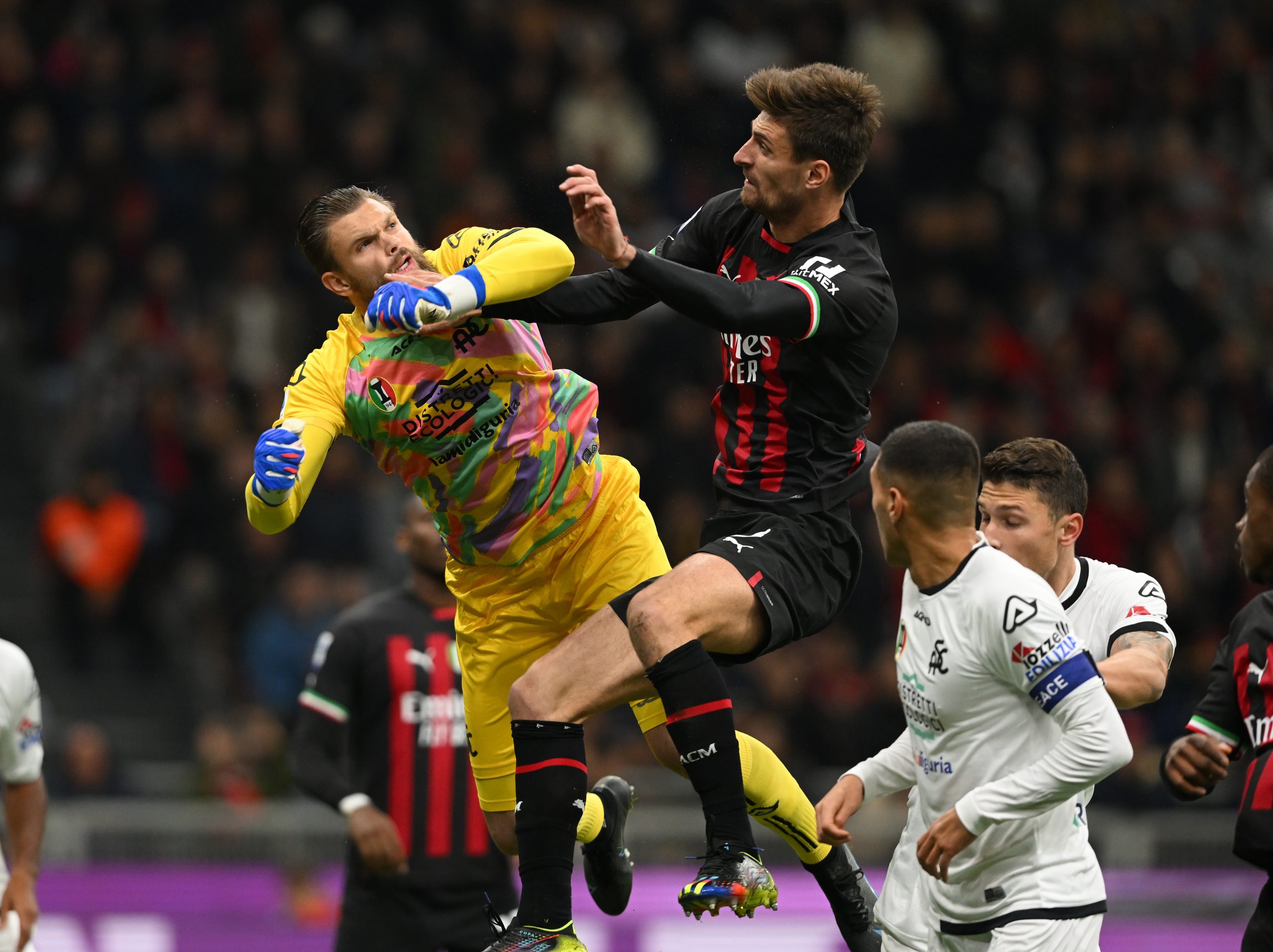 MILAN, ITALY - NOVEMBER 05: Matteo Gabbia of AC Milan competes for the ball with Bartlomiej Dragowski of Spezia Calcio during the Serie A match between AC MIlan and Spezia Calcio at Stadio Giuseppe Meazza on November 05, 2022 in Milan, Italy. (Photo by Claudio Villa/AC Milan via Getty Images)