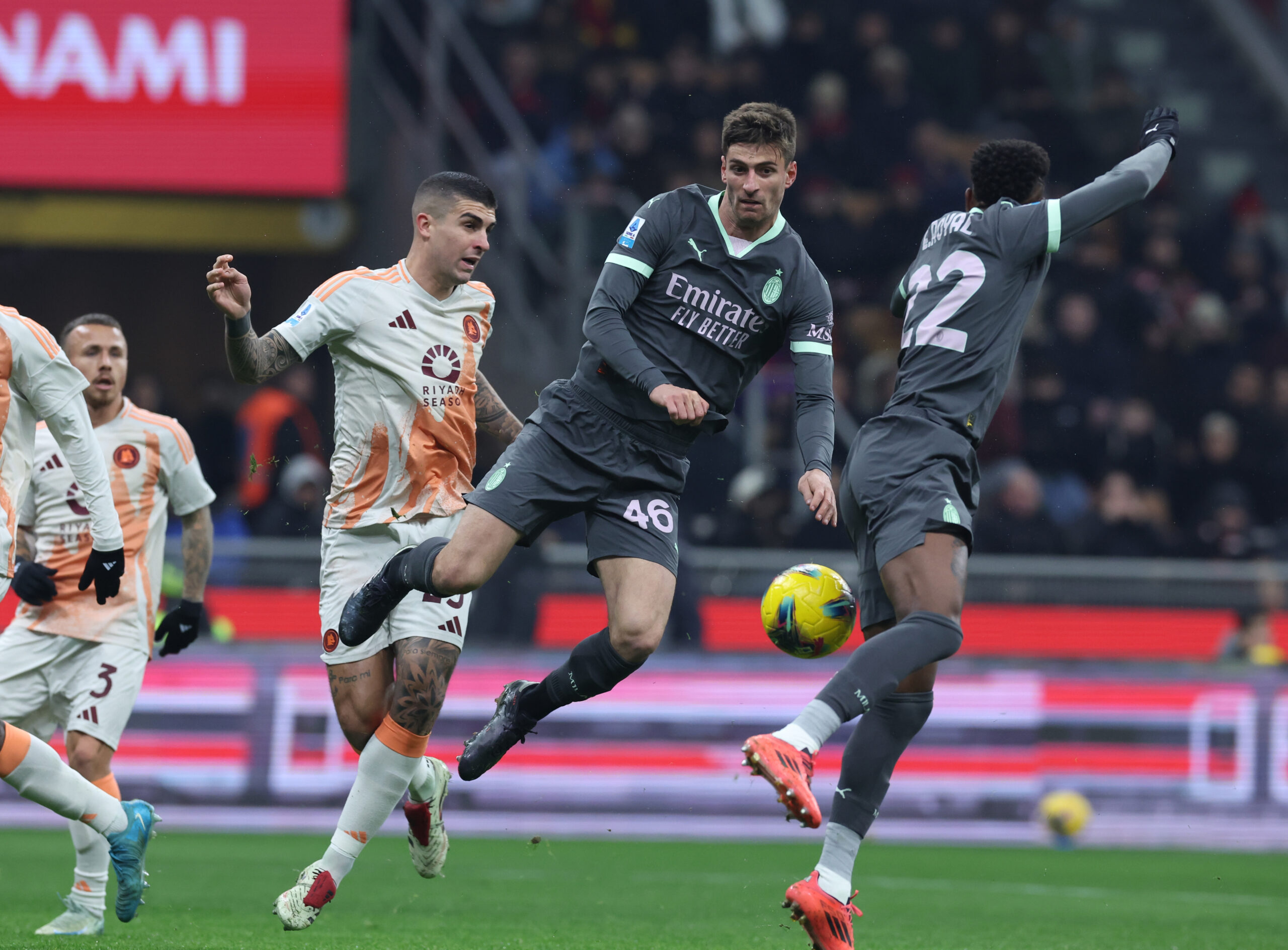MILAN, ITALY - DECEMBER 29: Matteo Gabbia of AC Milan competes for the ball with Gianluca Mancini of AS Roma during the Serie A match between AC Milan and Roma at Stadio Giuseppe Meazza on December 29, 2024 in Milan, Italy. (Photo by Claudio Villa/AC Milan via Getty Images)