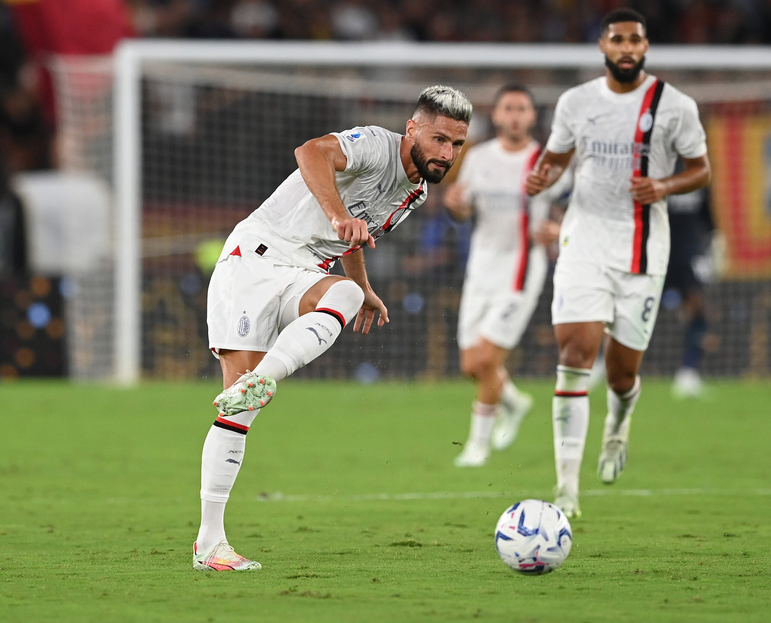 ROME, ITALY - SEPTEMBER 01: Olivier Giroud of AC Milan in action during the Serie A TIM match between AS Roma and AC Milan at Stadio Olimpico on September 01, 2023 in Rome, Italy. (Photo by Claudio Villa/AC Milan via Getty Images)