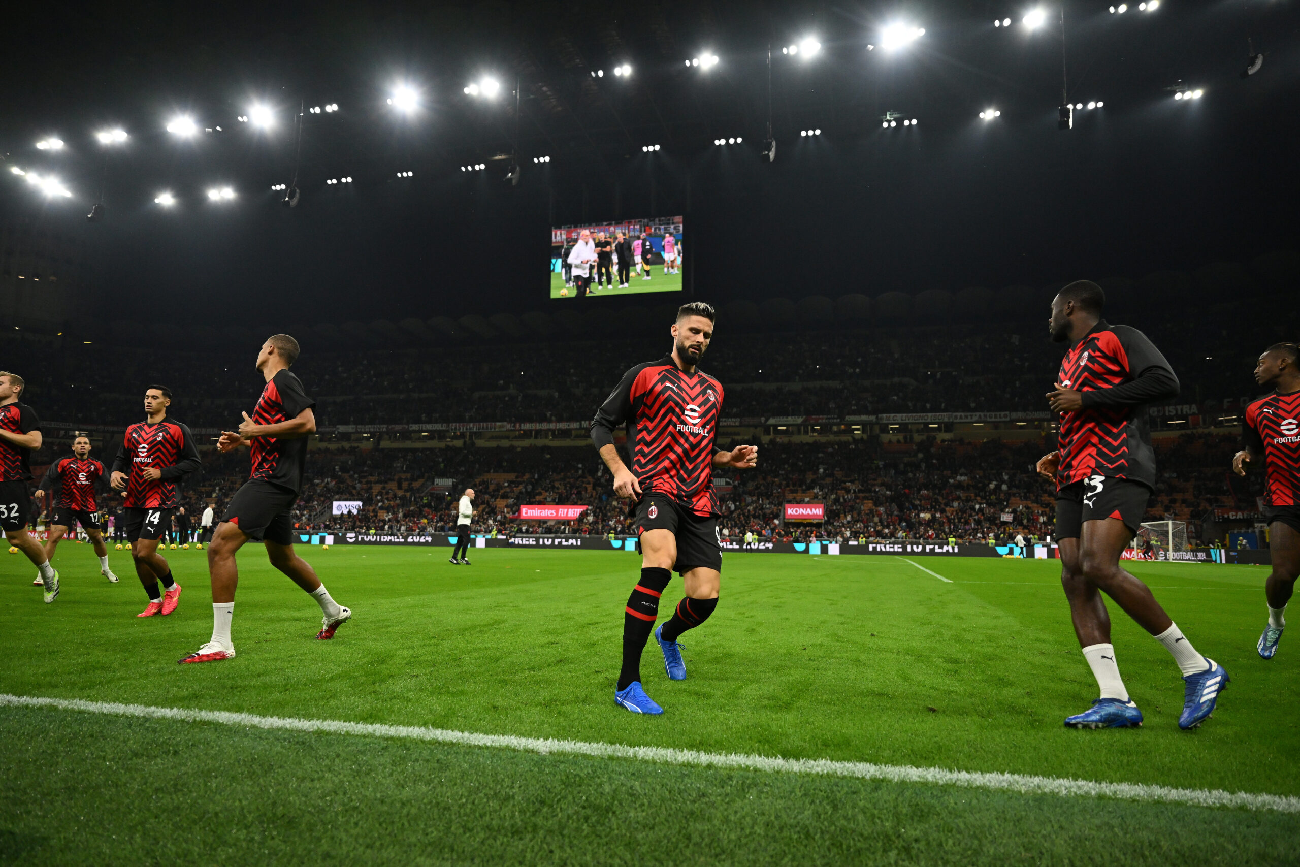 MILAN, ITALY - OCTOBER 22: Olivier Giroud of AC Milan warms up ahead before the Serie A TIM match between AC Milan and Juventus at Stadio Giuseppe Meazza on October 22, 2023 in Milan, Italy. (Photo by Claudio Villa/AC Milan via Getty Images)