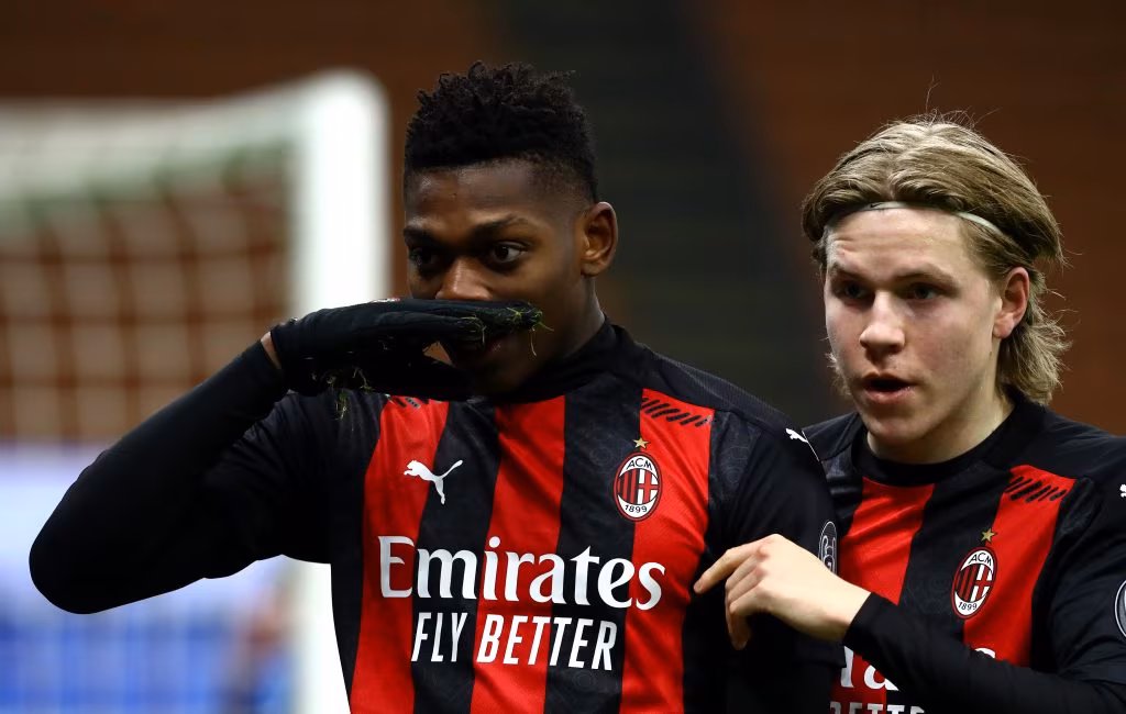 Rafael Leao esulta dopo il goal al Torino abbracciato da Jens Petter Hauge