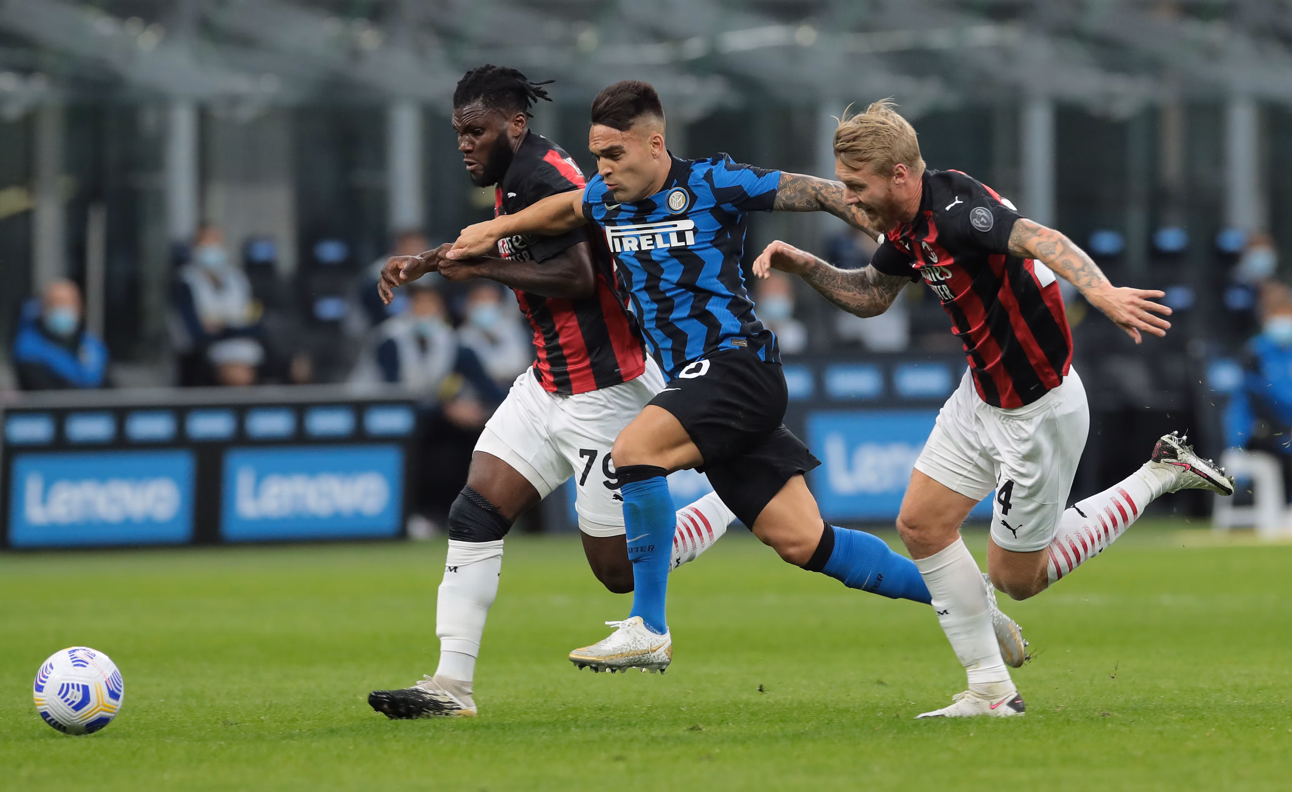 MILAN, ITALY - OCTOBER 17: Lautaro Martinez of FC Internazionale competes for the ball with Simon Kjær and Franck Kessie of AC Milan during the Serie A match between FC Internazionale and AC Milan at Stadio Giuseppe Meazza on October 17, 2020 in Milan, Italy. (Photo by Emilio Andreoli - Inter/Inter via Getty Images)