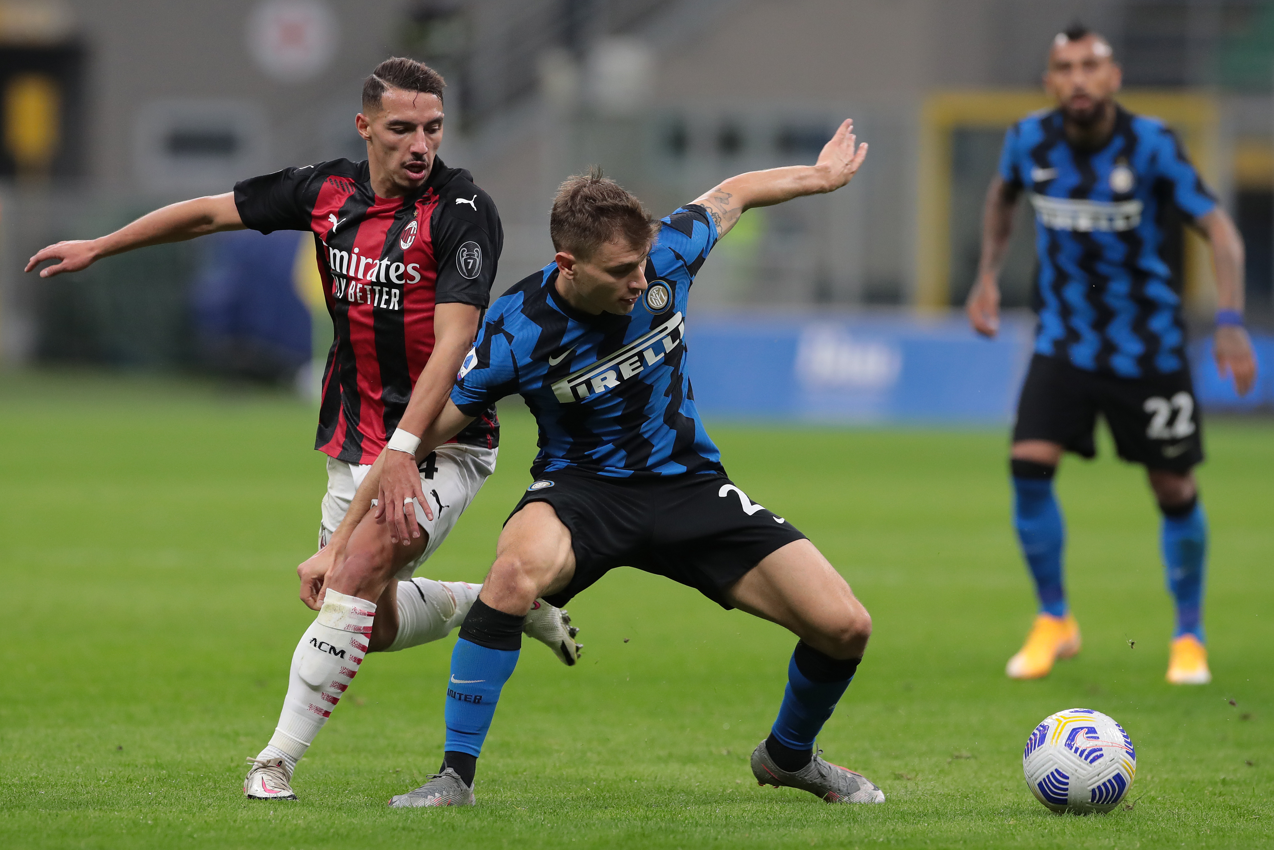 MILAN, ITALY - OCTOBER 17: Nicolo Barella of FC Internazionale competes for the ball with Ismaël Bennacer of AC Milan during the Serie A match between FC Internazionale and AC Milan at Stadio Giuseppe Meazza on October 17, 2020 in Milan, Italy. (Photo by Emilio Andreoli - Inter/Inter via Getty Images)