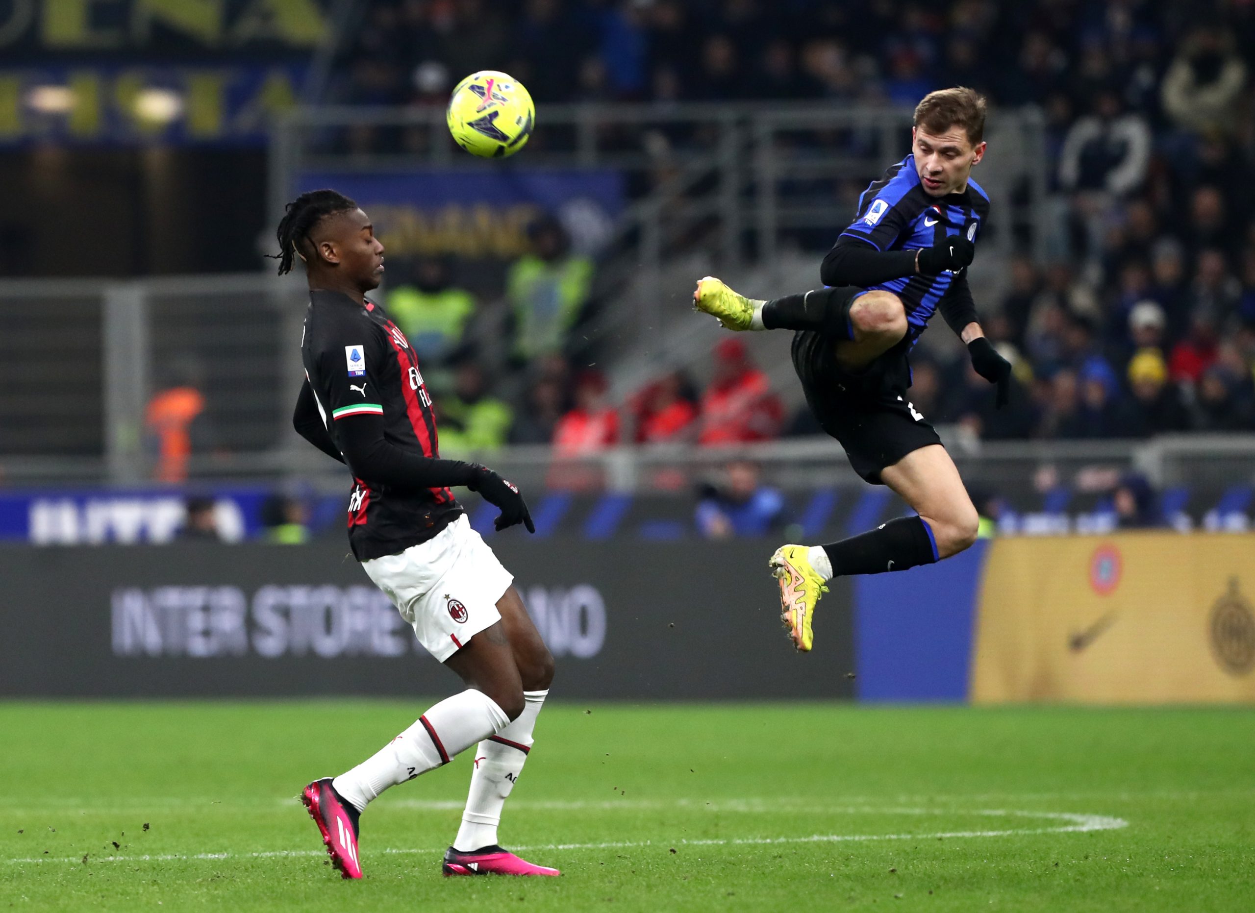 MILAN, ITALY - FEBRUARY 05: Rafael Leao of AC Milan battles for possession with Nicolo Barella of FC Internazionale during the Serie A match between FC Internazionale and AC MIlan at Stadio Giuseppe Meazza on February 05, 2023 in Milan, Italy. (Photo by Marco Luzzani/Getty Images)