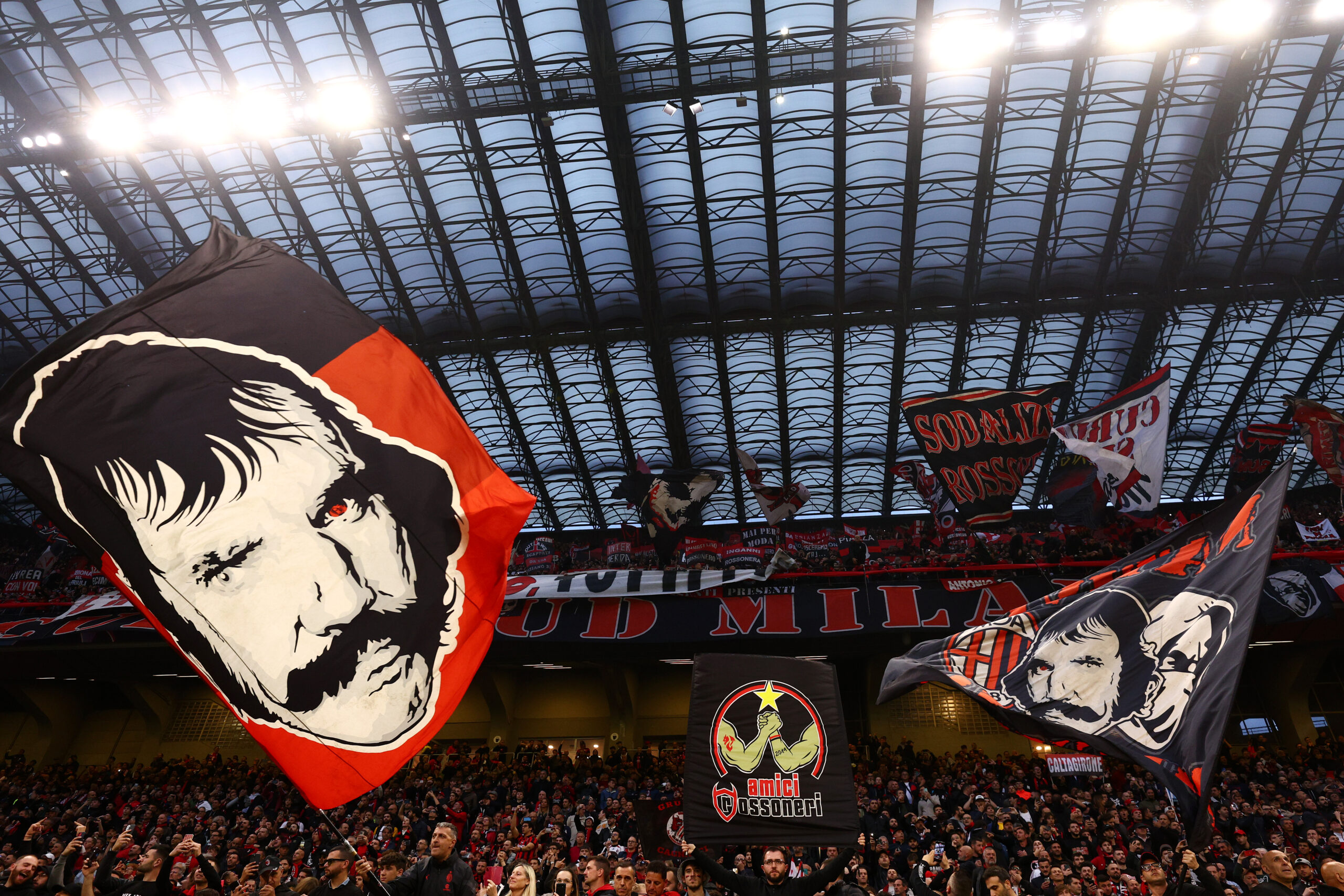 MILAN, ITALY - MAY 10: A general view as fans of AC Milan wave flags and banners prior to the UEFA Champions League semi-final first leg match between AC Milan and FC Internazionale at San Siro on May 10, 2023 in Milan, Italy. (Photo by Clive Rose/Getty Images)