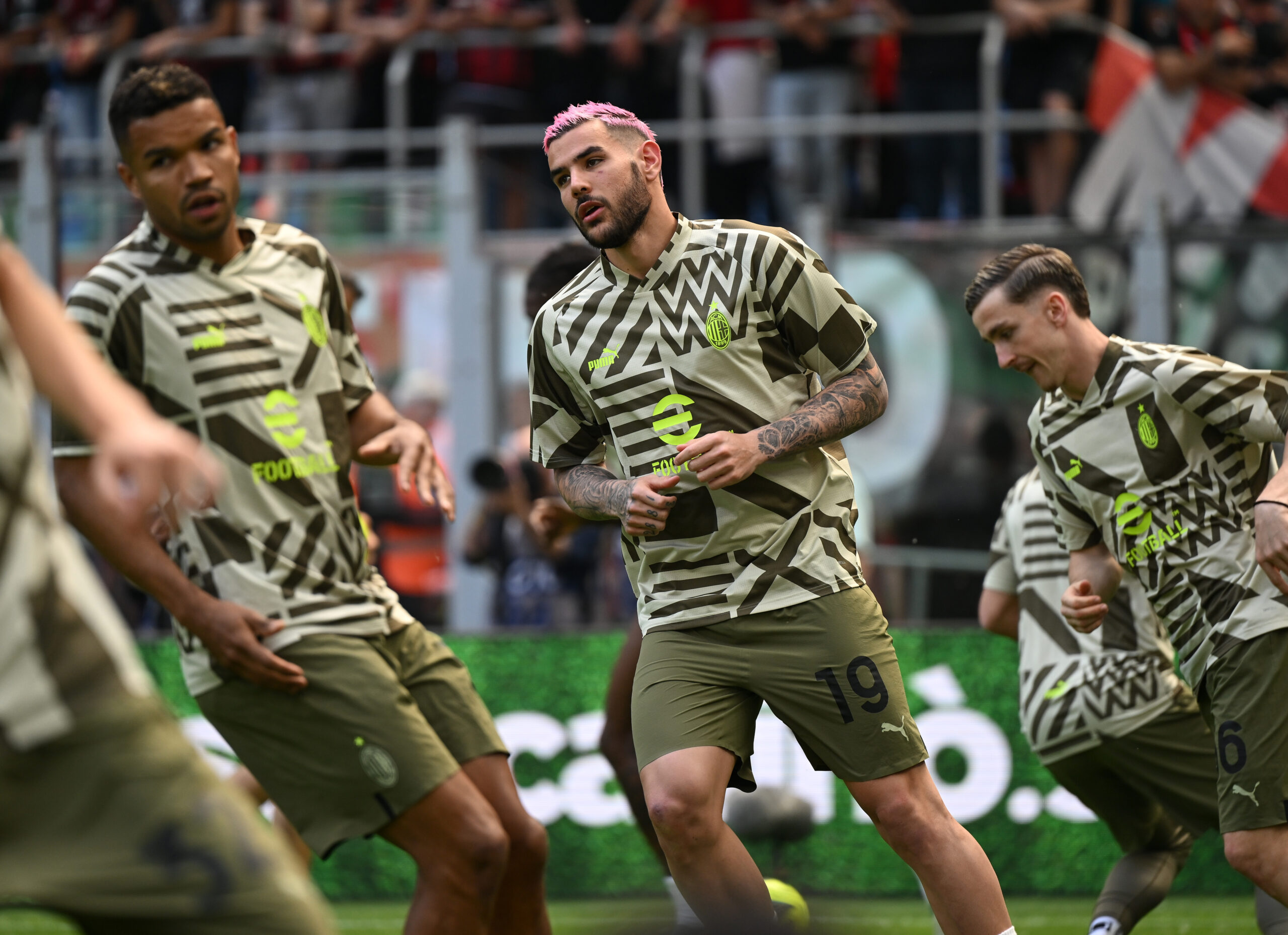 MILAN, ITALY - MAY 06: Theo Hernandez of AC Milan warms up ahead before the Serie A match between AC Milan and SS Lazio at Stadio Giuseppe Meazza on May 06, 2023 in Milan, Italy. (Photo by Claudio Villa/AC Milan via Getty Images)