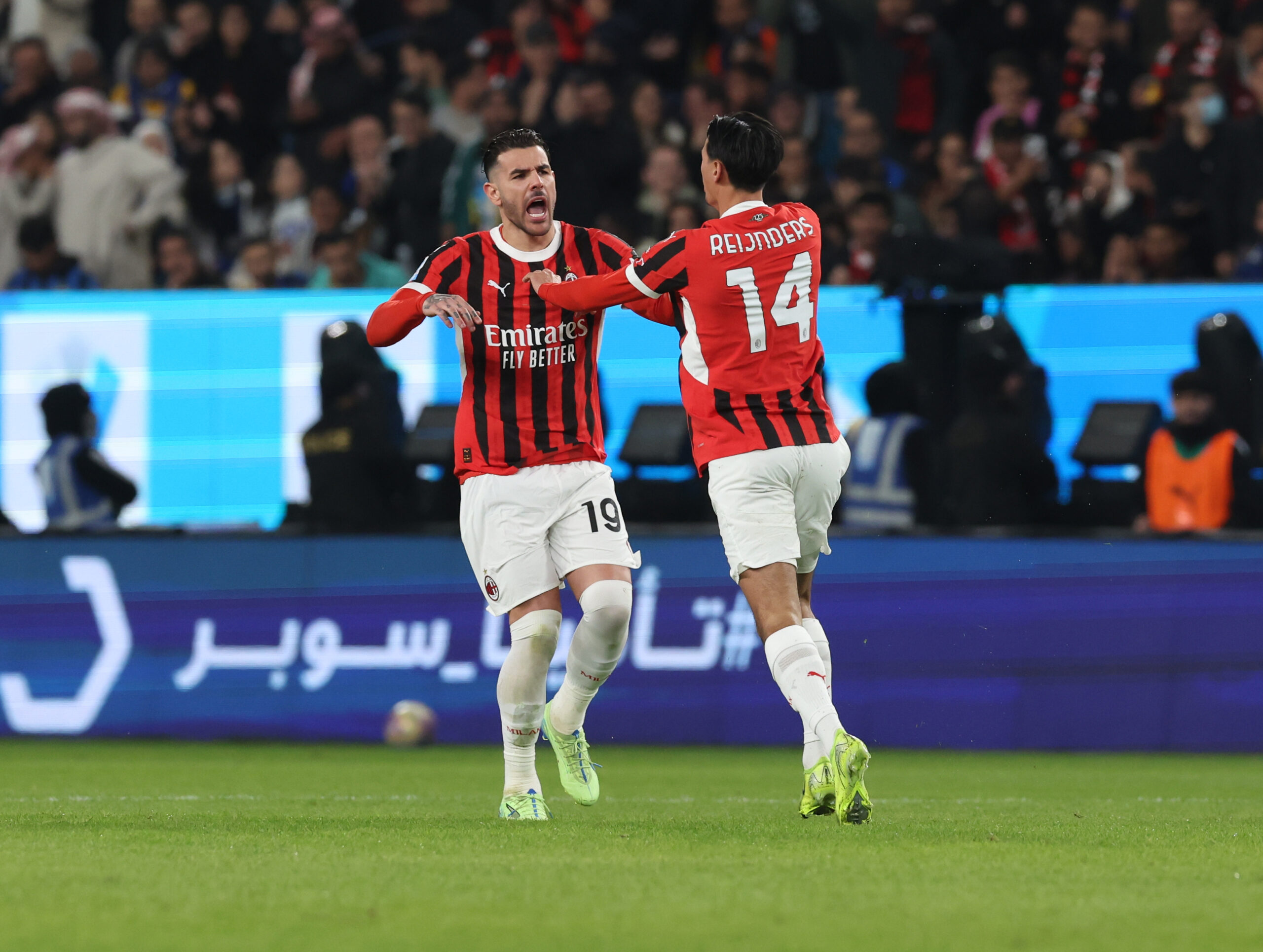 RIYADH, SAUDI ARABIA - JANUARY 06: Theo Hernandez of AC Milan celebrates with Tijjani Reijnders after scoring the goal during the Italian Super Cup Final match between FC Internazionale and AC Milan at Al- Awwal Park Stadium on January 06, 2025 in Riyadh, Saudi Arabia. (Photo by Claudio Villa/AC Milan via Getty Images)