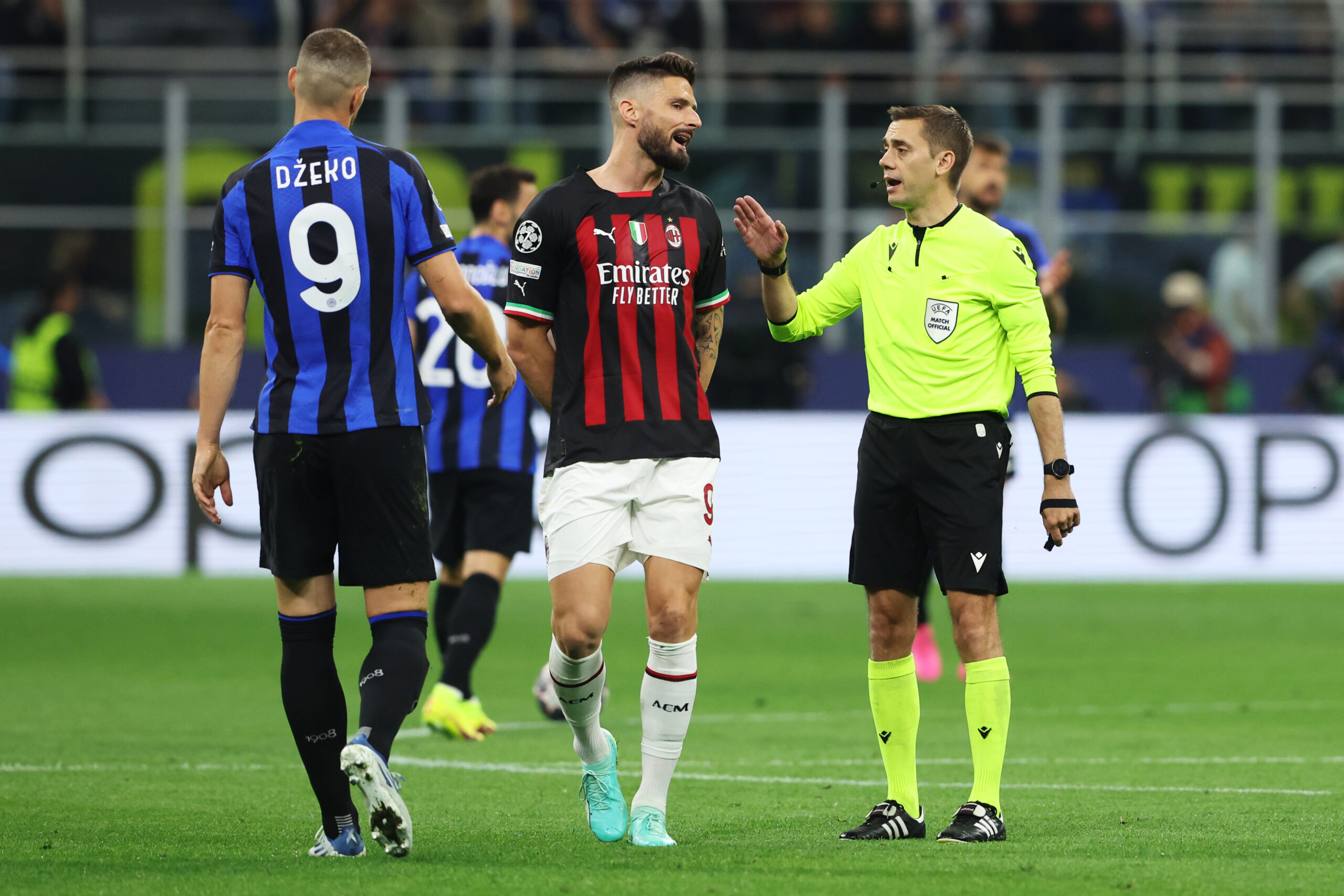 MILAN, ITALY - MAY 16: Referee, Clement Turpin confronts Olivier Giroud of AC Milan during the UEFA Champions League semi-final second leg match between FC Internazionale and AC Milan at Stadio Giuseppe Meazza on May 16, 2023 in Milan, Italy. (Photo by Alexander Hassenstein/Getty Images)