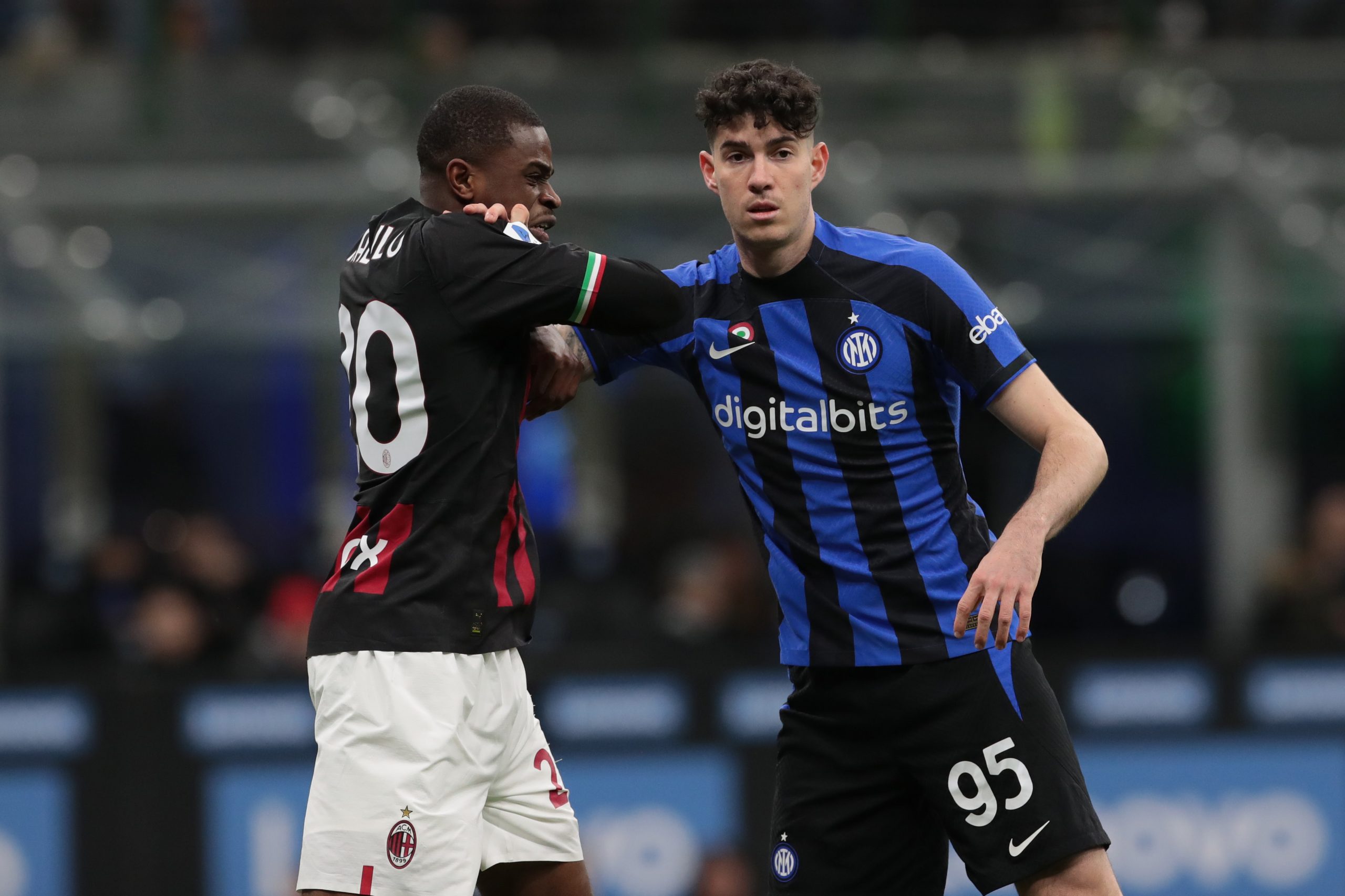 MILAN, ITALY - FEBRUARY 05: Alessandro Bastoni of FC Internazionale in action, battles for the ball with Pierre Kalulu of AC Milan during the Serie A match between FC Internazionale and AC MIlan at Stadio Giuseppe Meazza on February 05, 2023 in Milan, Italy. (Photo by Emilio Andreoli - Inter/Inter via Getty Images)