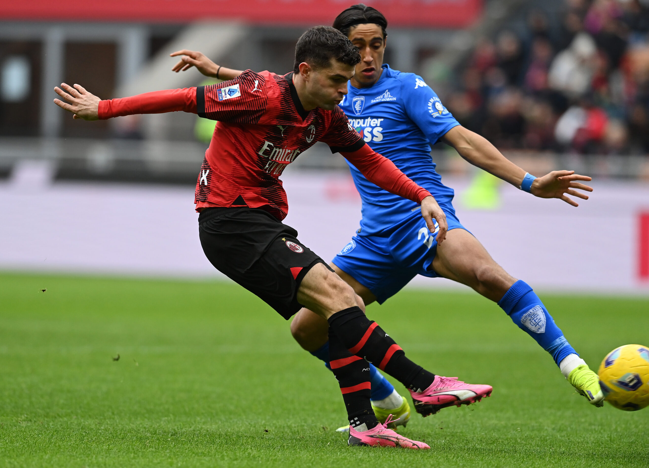 MILAN, ITALY - MARCH 10: Christian Pulisic of AC Milan in action during the Serie A TIM match between AC Milan and Empoli FC - Serie A TIM at Stadio Giuseppe Meazza on March 10, 2024 in Milan, Italy. (Photo by Claudio Villa/AC Milan via Getty Images) (Photo by Claudio Villa/AC Milan via Getty Images)