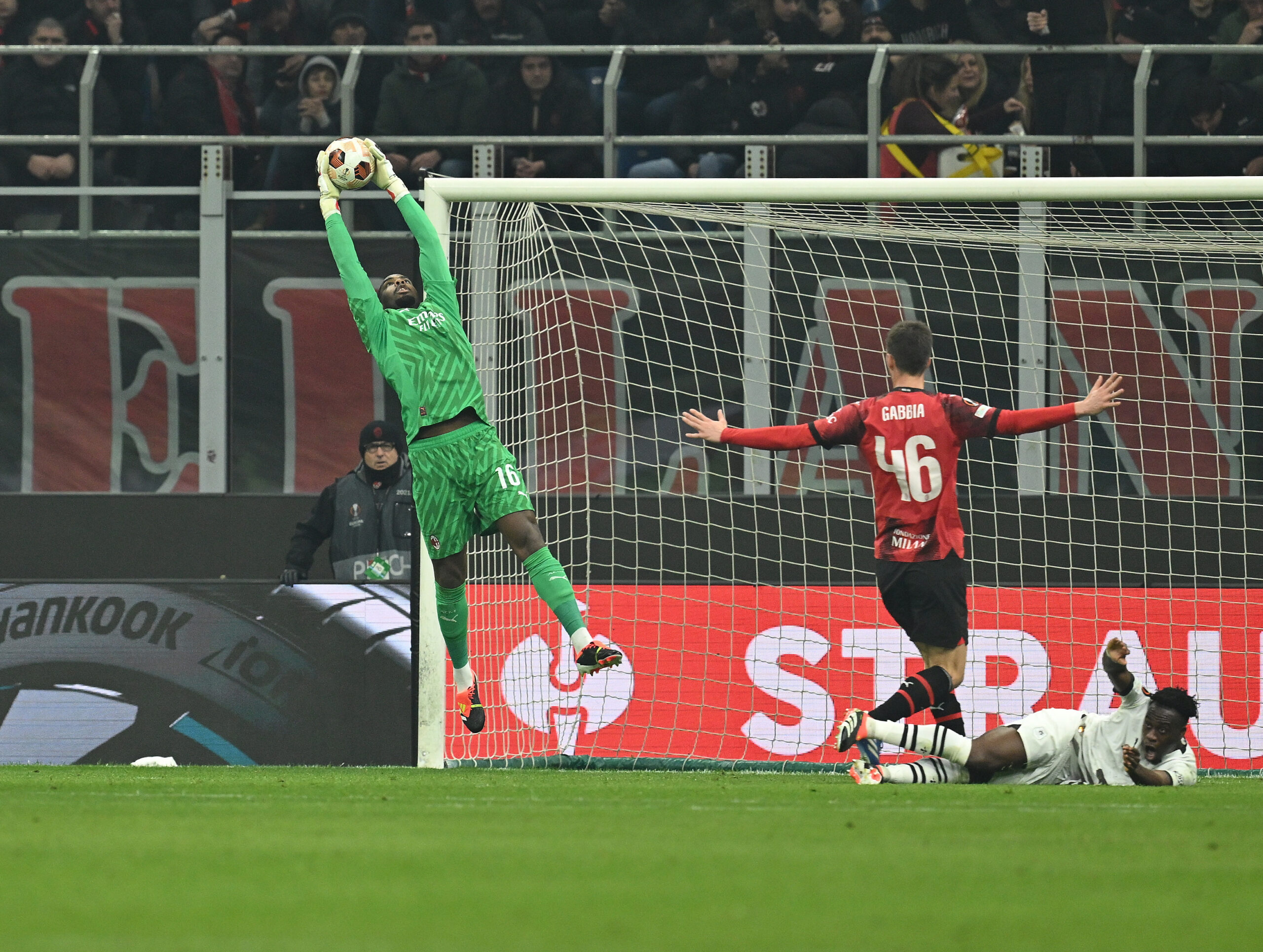MILAN, ITALY - FEBRUARY 15: Mike Maignan of AC Milan grabs the ball during the UEFA Europa League 2023/24 Playoff First Leg between AC Milan and Stade Rennais FC at Stadio Giuseppe Meazza on February 15, 2024 in Milan, Italy. (Photo by Claudio Villa/AC Milan via Getty Images)