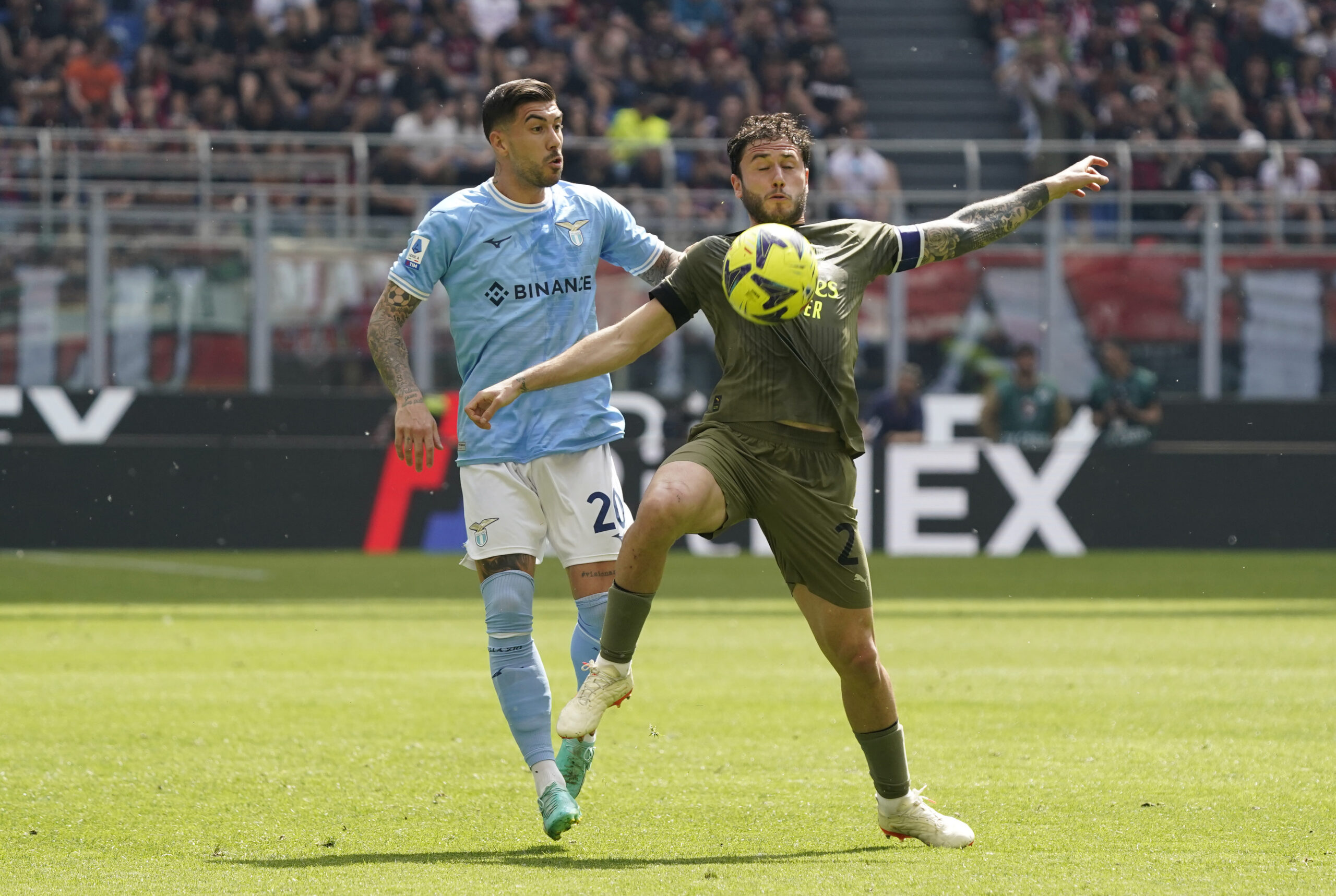 MILAN, ITALY - MAY 06: Davide Calabria of AC Milan competes for the ball with Mattia Zaccagni of SS Lazio during the Serie A match between AC Milan and SS Lazio at Stadio Giuseppe Meazza on May 06, 2023 in Milan, Italy. (Photo by Pier Marco Tacca/AC Milan via Getty Images)