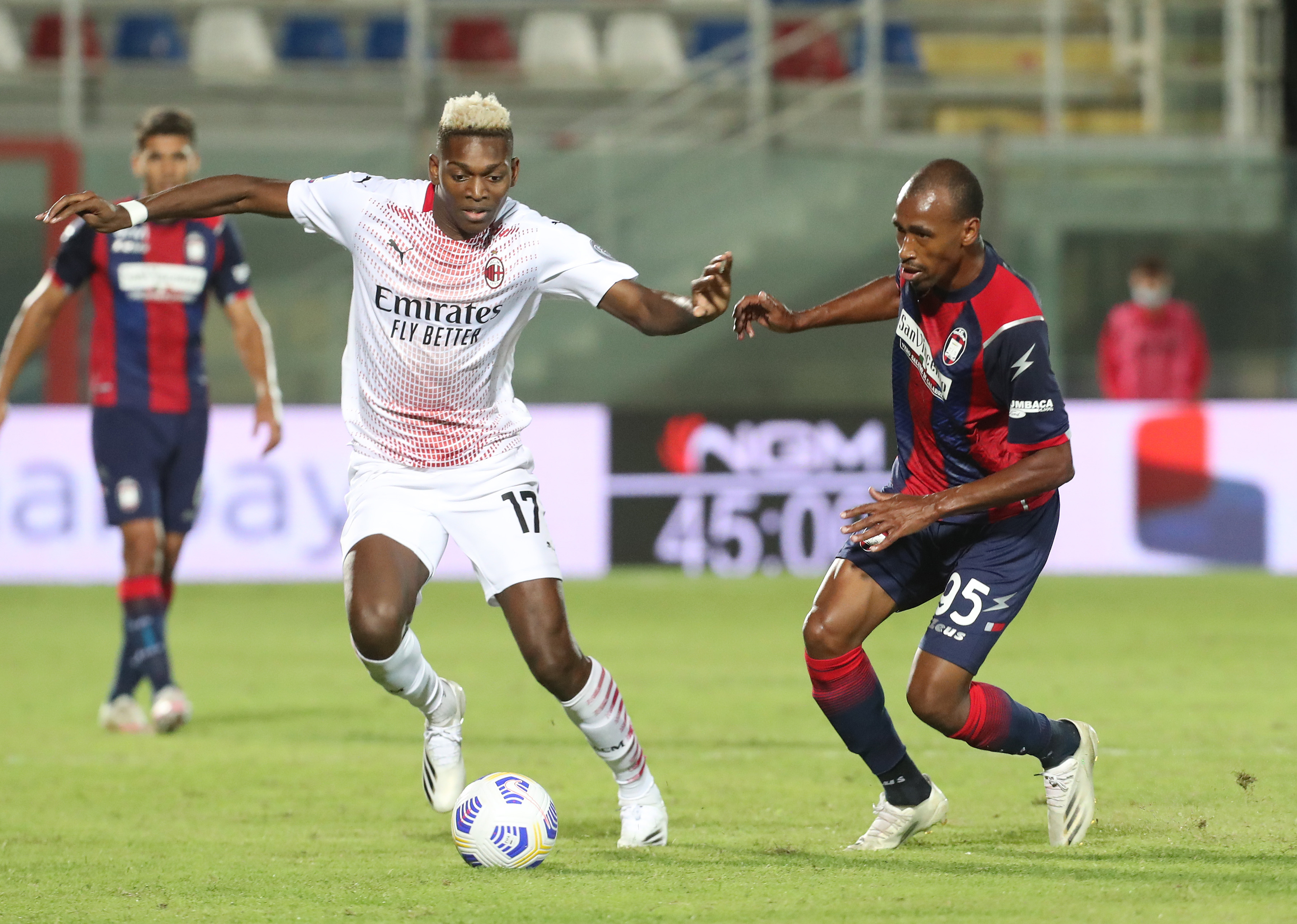 CROTONE, ITALY - SEPTEMBER 27: Edoardo Luca Cigarini of Crotone competes for the ball with Rafael Leao of Milan during the Serie A match between FC Crotone and AC Milan at Stadio Comunale Ezio Scida on September 27, 2020 in Crotone, Italy. (Photo by Maurizio Lagana/Getty Images)