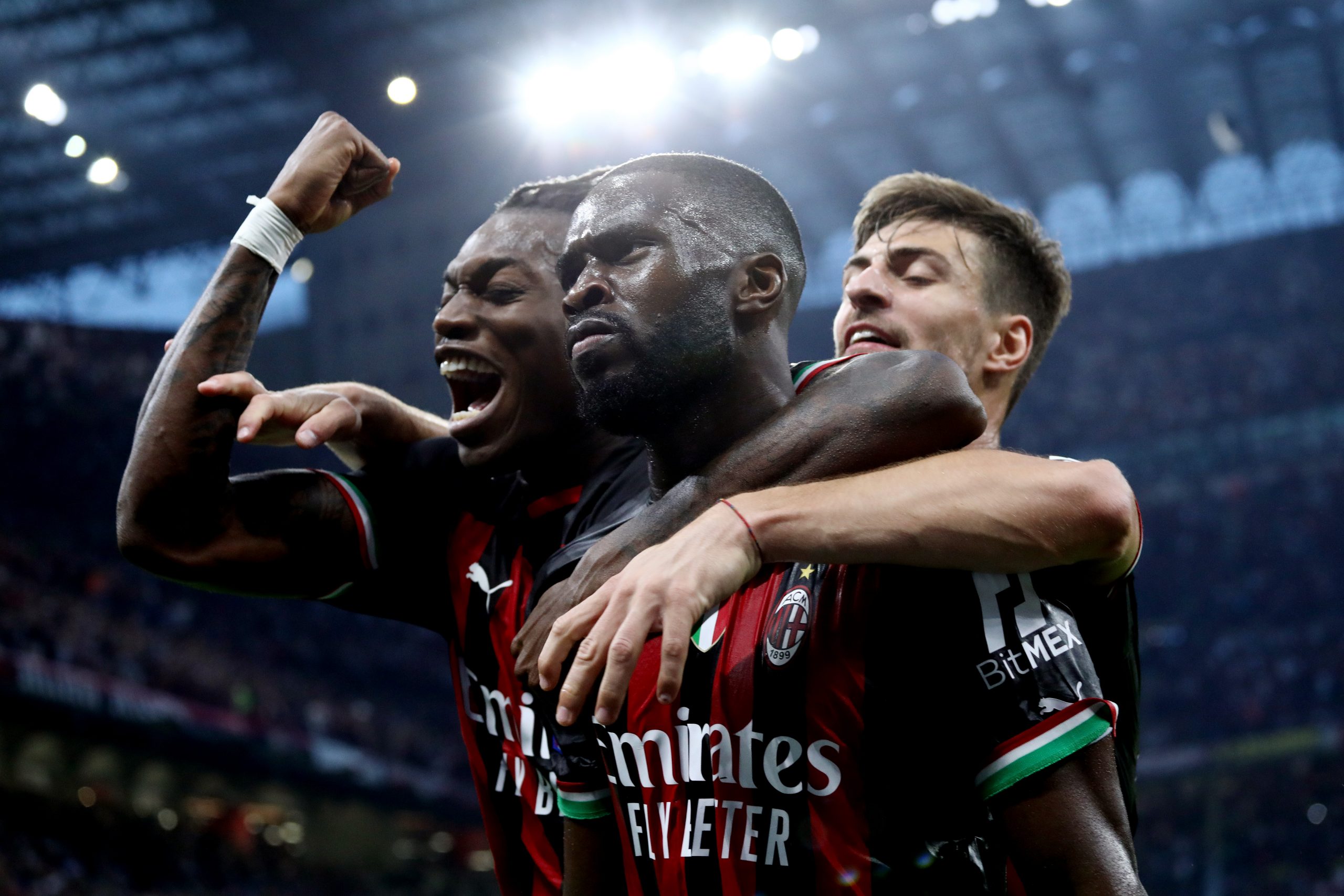 MILAN, ITALY - OCTOBER 08: Fikayo Tomori of AC Milan celebrates scoring their side's first goal with teammates during the Serie A match between AC Milan and Juventus at Stadio Giuseppe Meazza on October 08, 2022 in Milan, Italy. (Photo by Marco Luzzani/Getty Images)