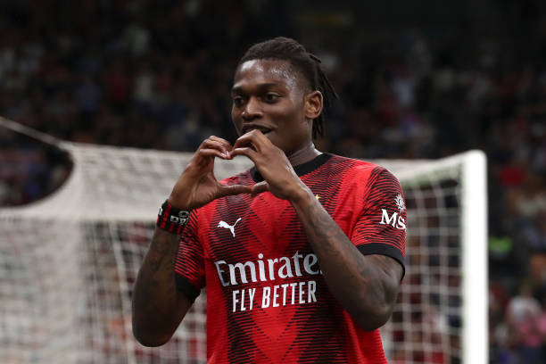 MILAN, ITALY - MAY 11: Rafael Leao of AC Milan celebrates scoring his team's fourth goal during the Serie A TIM match between AC Milan and Cagliari at Stadio Giuseppe Meazza on May 11, 2024 in Milan, Italy. (Photo by Marco Luzzani/Getty Images)