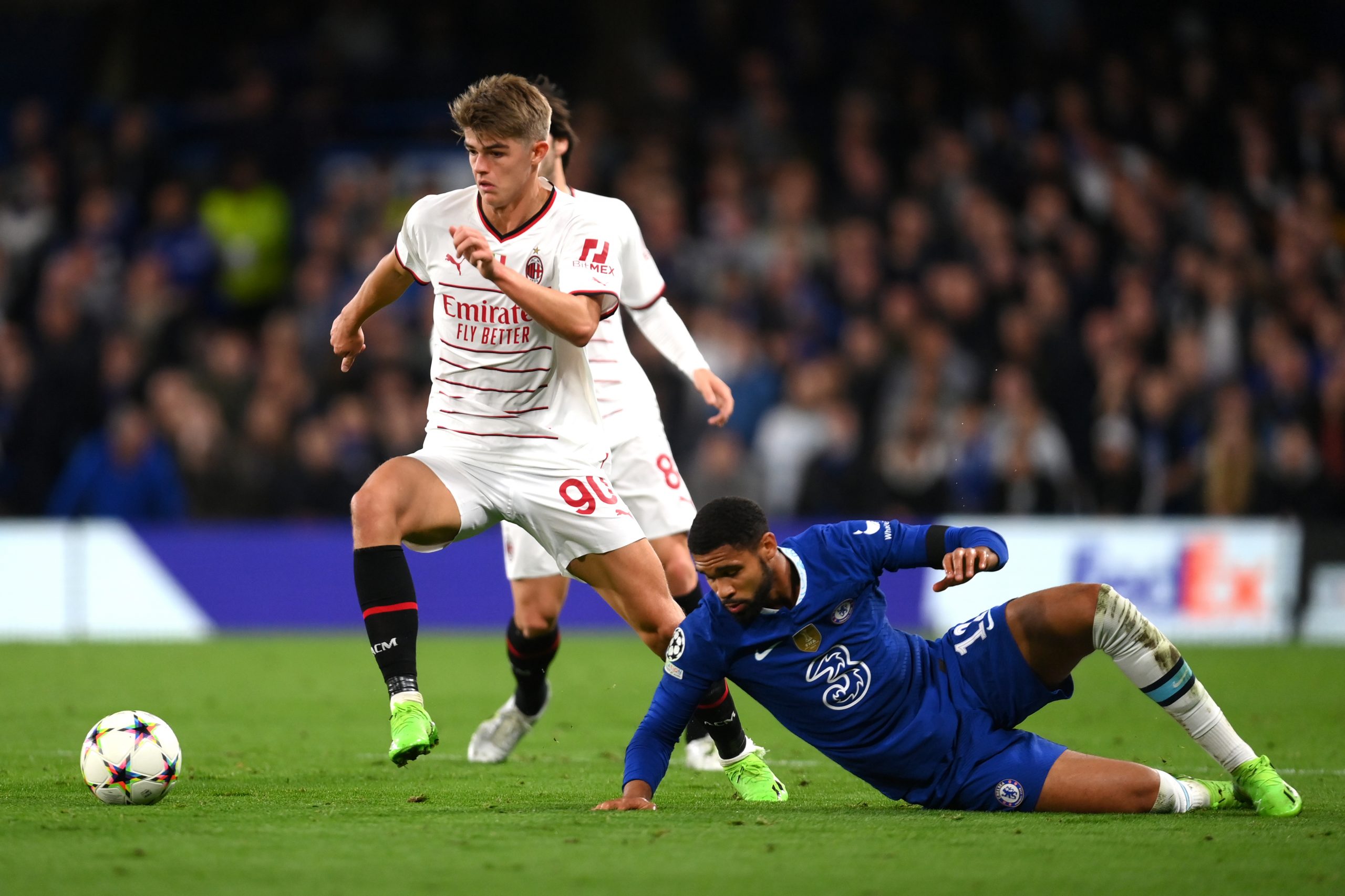 LONDON, ENGLAND - OCTOBER 05: Charles De Ketelaere of AC Milan is challenged by Ruben Loftus-Cheek of Chelsea during the UEFA Champions League group E match between Chelsea FC and AC Milan at Stamford Bridge on October 05, 2022 in London, England. (Photo by Mike Hewitt/Getty Images)