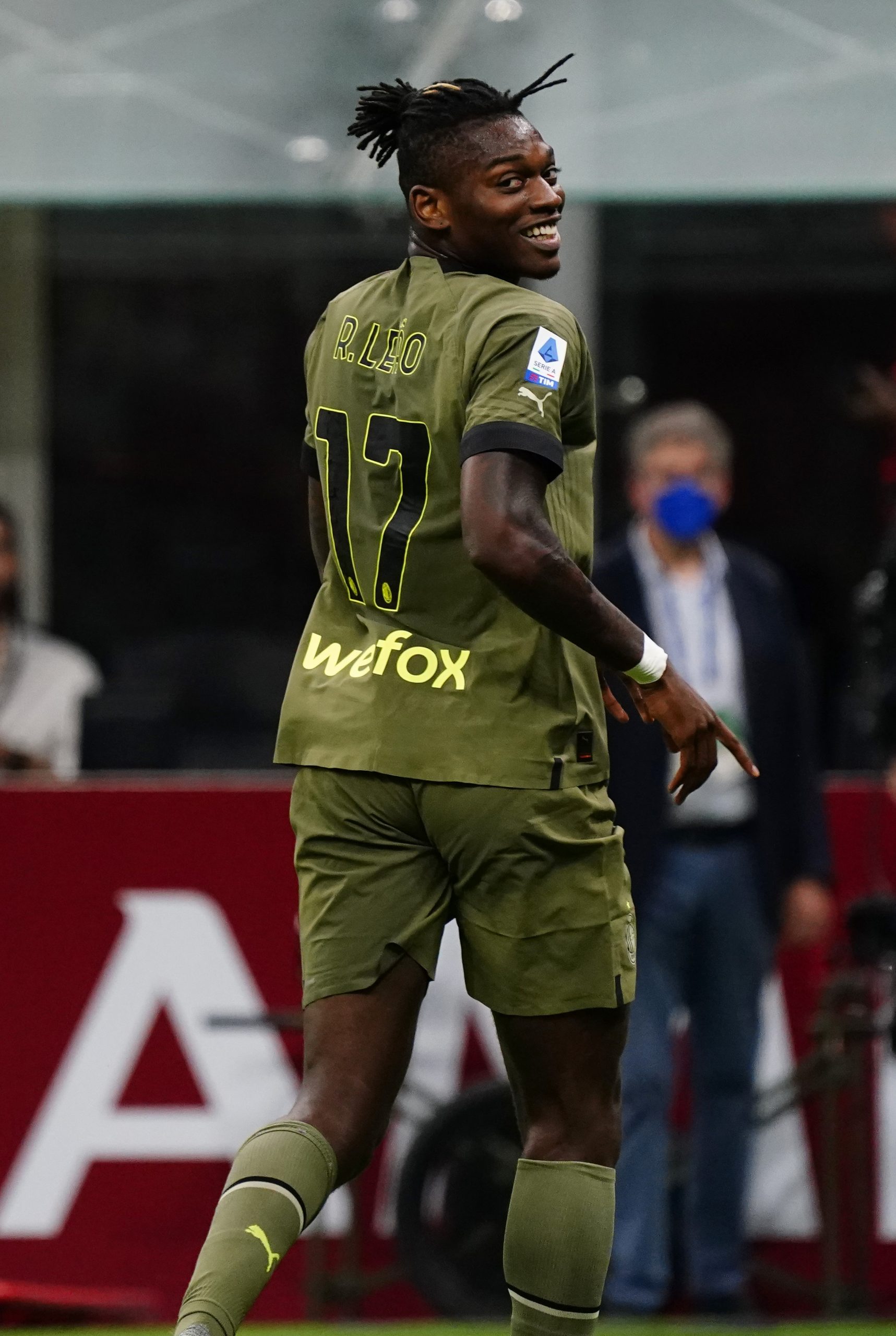 MILAN, ITALY - AUGUST 27: Rafael Leão of AC Milan celebrates after scoring his team's first goal during the Serie A match between AC Milan and Bologna FC at Stadio Giuseppe Meazza on August 27, 2022 in Milan, Italy. (Photo by Pier Marco Tacca/AC Milan via Getty Images)