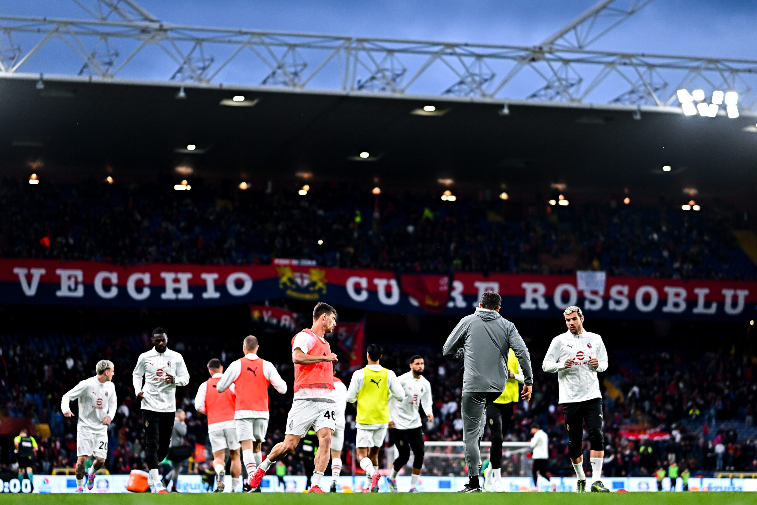 GENOA, ITALY - MAY 5: Milan players are seen in action during a warm-up session prior to kick-off in the Serie A match between Genoa and AC Milan at Stadio Luigi Ferraris on May 5, 2025 in Genoa, Italy. (Photo by Simone Arveda/Getty Images)