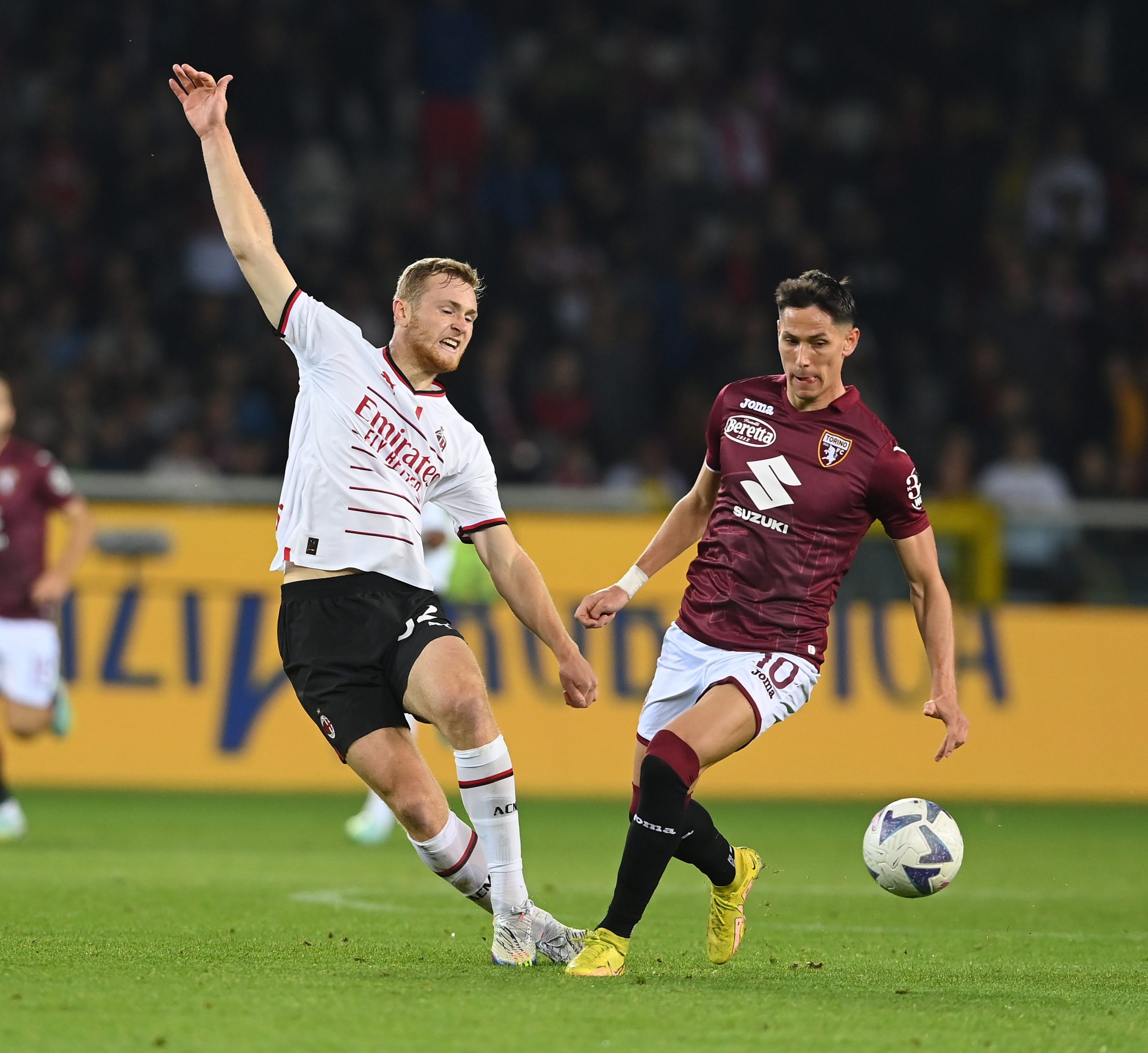 TURIN, ITALY - OCTOBER 30: Tommaso Pobega of AC Milan competes for the ball with Sasa Lukic of Torino FC during the Serie A match between Torino FC and AC Milan at Stadio Olimpico di Torino on October 30, 2022 in Turin, Italy. (Photo by Claudio Villa/AC Milan via Getty Images)