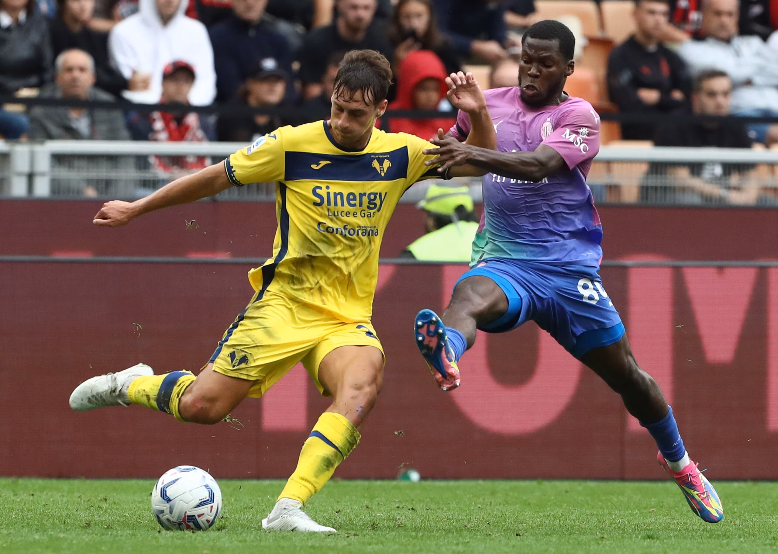 MILAN, ITALY - SEPTEMBER 23: Filippo Terraciano of Hellas Verona FC competes for the ball with Yunus Musah of AC Milan during the Serie A TIM match between AC Milan and Hellas Verona FC at Stadio Giuseppe Meazza on September 23, 2023 in Milan, Italy. (Photo by Marco Luzzani/Getty Images)