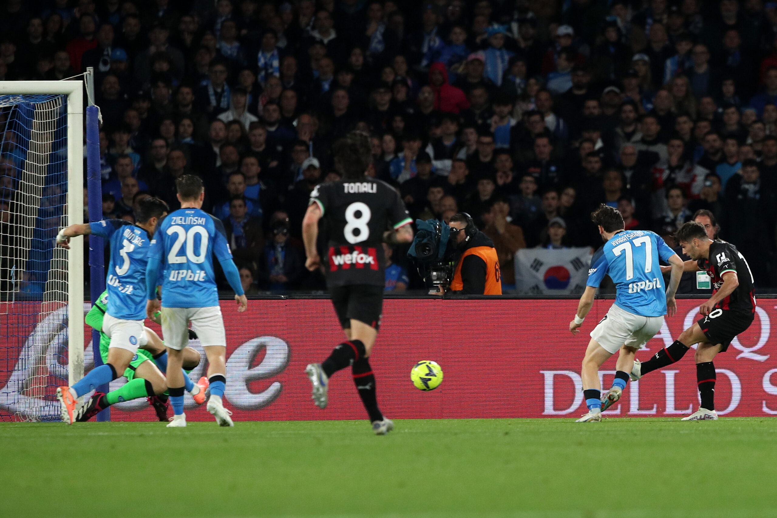 NAPLES, ITALY - APRIL 02: Brahim Diaz of AC Milan scores the 0-2 goal during the Serie A match between SSC Napoli and AC Milan at Stadio Diego Armando Maradona on April 02, 2023 in Naples, Italy. (Photo by Francesco Pecoraro/Getty Images)