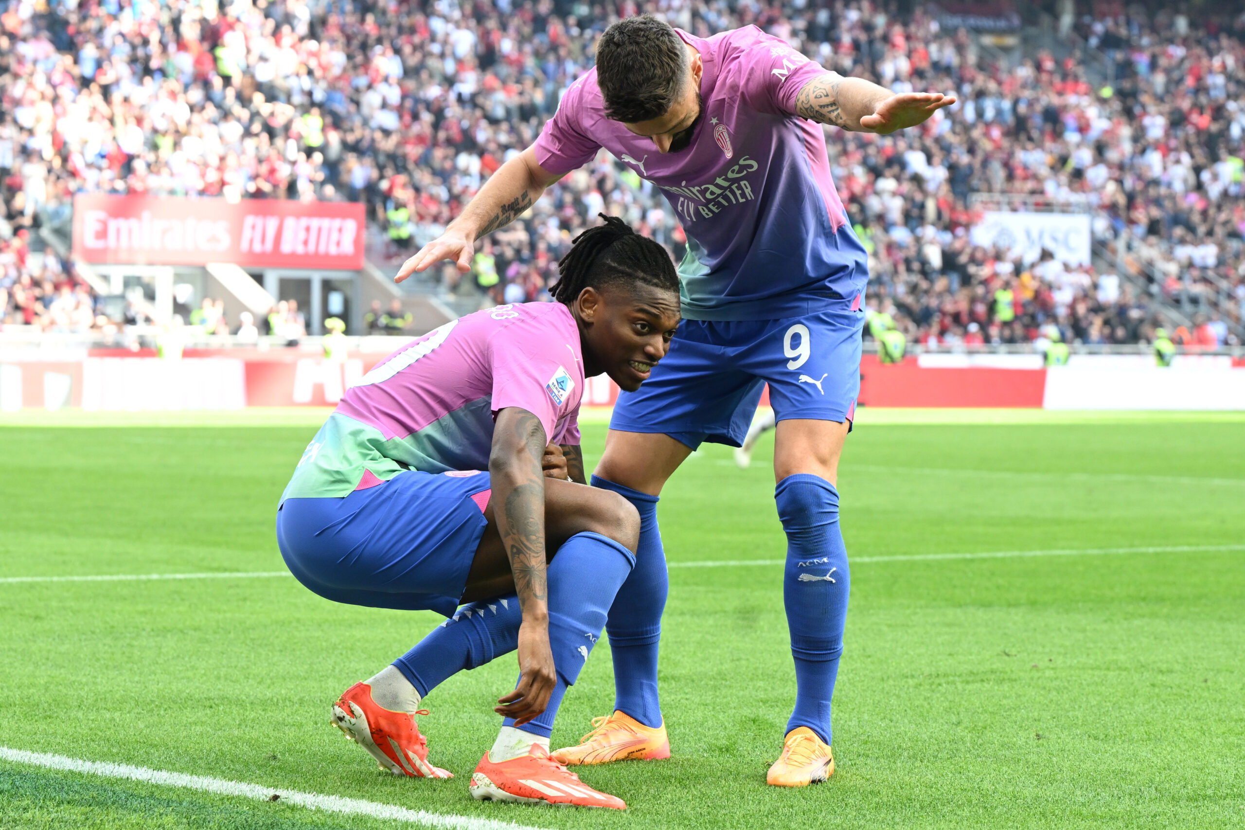 MILAN, ITALY - APRIL 06: Rafael Leao of AC Milan celebrates with Olivier Giroud after scoring the goal during the Serie A TIM match between AC Milan and US Lecce - Serie A TIM at Stadio Giuseppe Meazza on April 06, 2024 in Milan, Italy. (Photo by Claudio Villa/AC Milan via Getty Images)