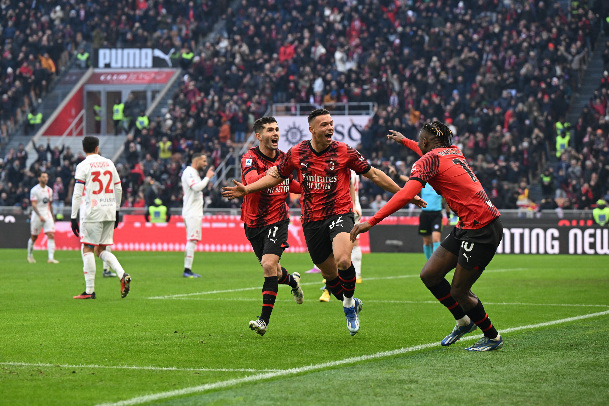 MILAN, ITALY - DECEMBER 17: Jan Carlo Simic of AC Milan celebrates with team-mates after scoring the goal during the Serie A TIM match between AC Milan and AC Monza at Stadio Giuseppe Meazza on December 17, 2023 in Milan, Italy. (Photo by Claudio Villa/AC Milan via Getty Images)