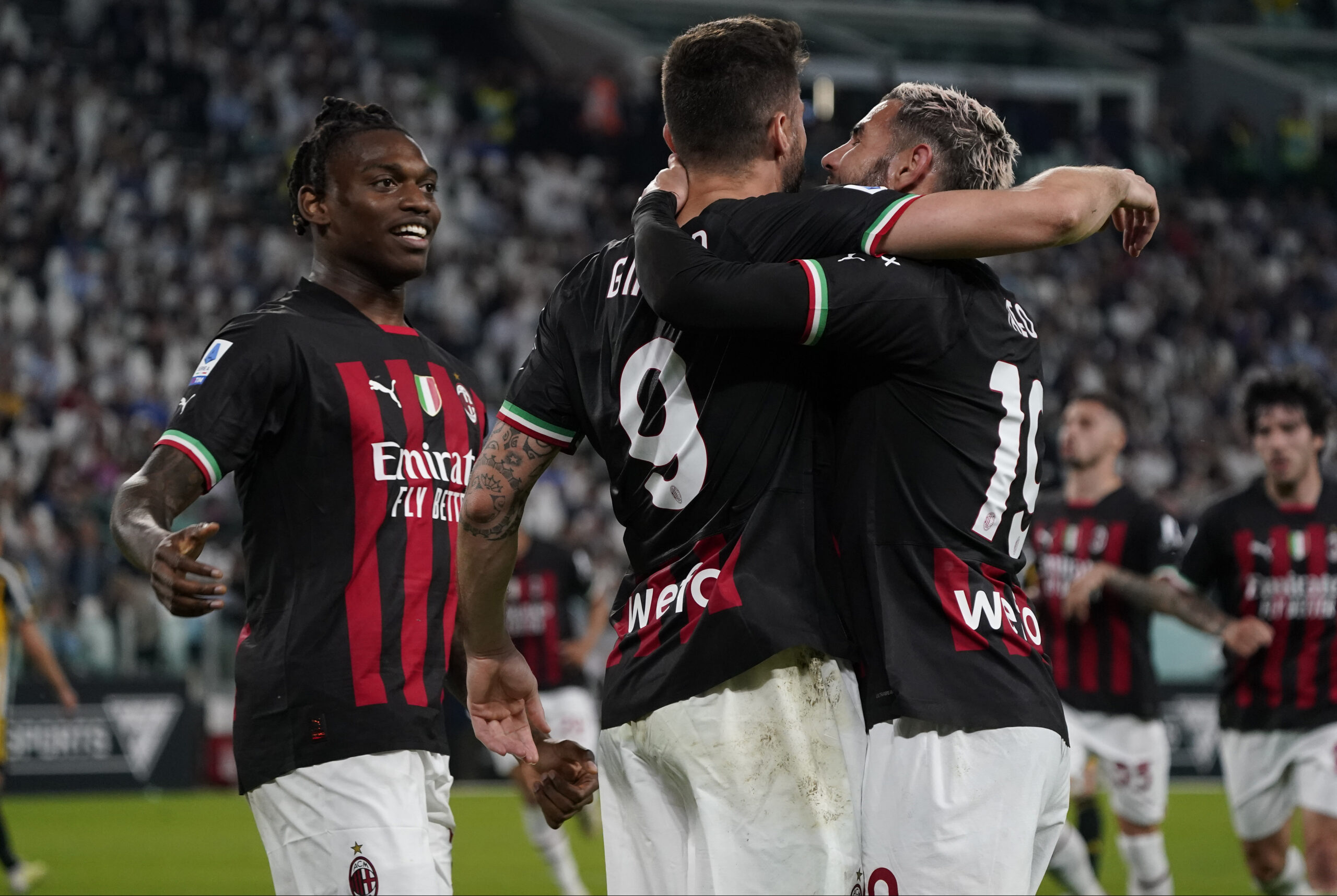 TURIN, ITALY - MAY 28: Olivier Giroud of AC Milan celebrates with teammate Théo Hernández of AC Milan after scoring his team's first goal during the Serie A match between Juventus and AC MIlan at Allianz Stadium on May 28, 2023 in Turin, Italy. (Photo by Pier Marco Tacca/AC Milan via Getty Images)