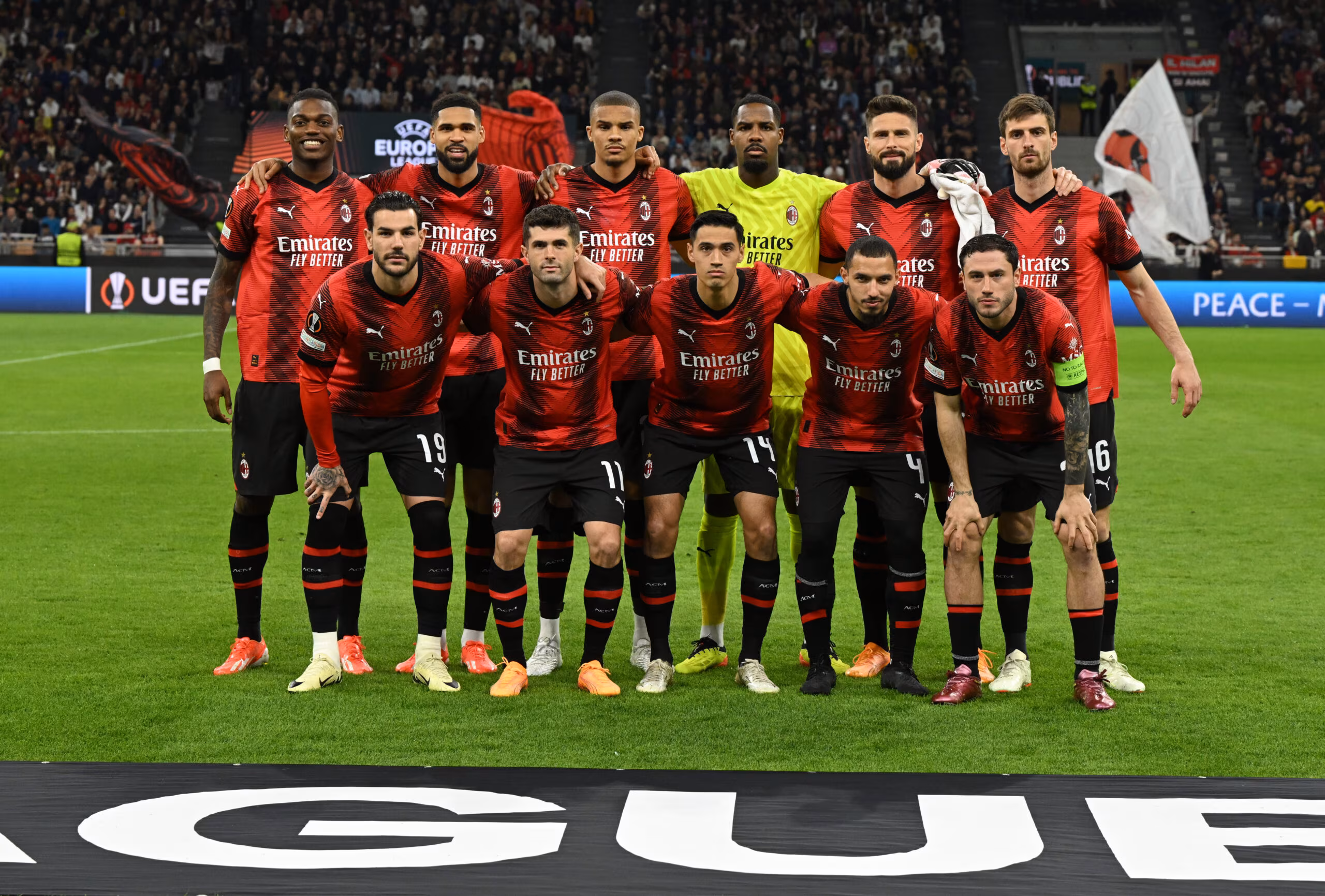 MILAN, ITALY - APRIL 11: Players of AC Milan line-up prior to the UEFA Europa League 2023/24 Quarter-Final first leg match between AC Milan and AS Roma at Stadio Giuseppe Meazza on April 11, 2024 in Milan, Italy. (Photo by Claudio Villa/AC Milan via Getty Images)