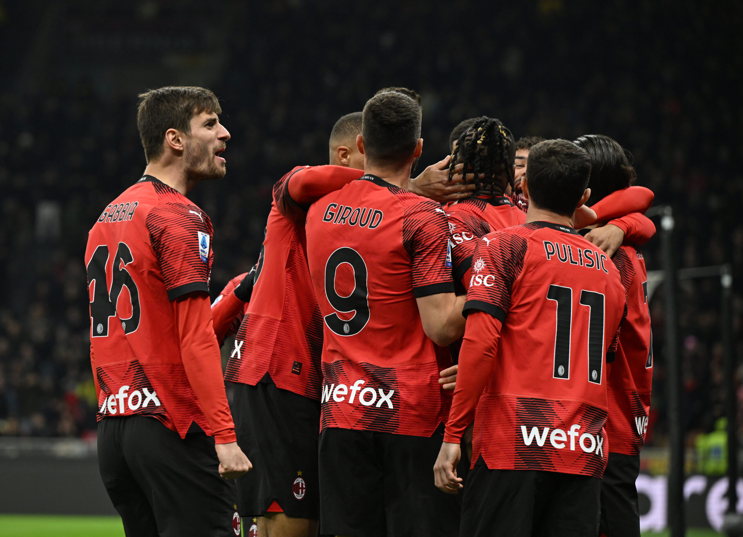 MILAN, ITALY - FEBRUARY 25: Rafael Leao of AC Milan celebrates with team-mates after scoring the goal during the Serie A TIM match between AC Milan and Atalanta BC at Stadio Giuseppe Meazza on February 25, 2024 in Milan, Italy. (Photo by Claudio Villa/AC Milan via Getty Images)