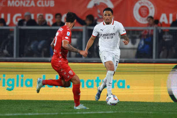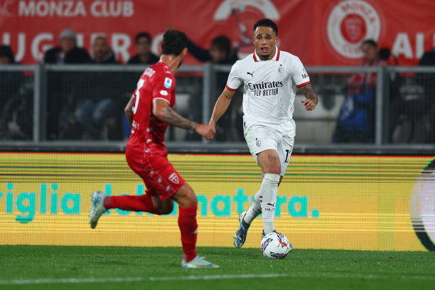 MONZA, ITALY - NOVEMBER 02: Noah Okafor of AC Milan is challenged by Pedro Pereira of AC Monza during the Serie A match between Monza and AC Milan at U-Power Stadium on November 02, 2024 in Monza, Italy. (Photo by Francesco Scaccianoce/Getty Images)