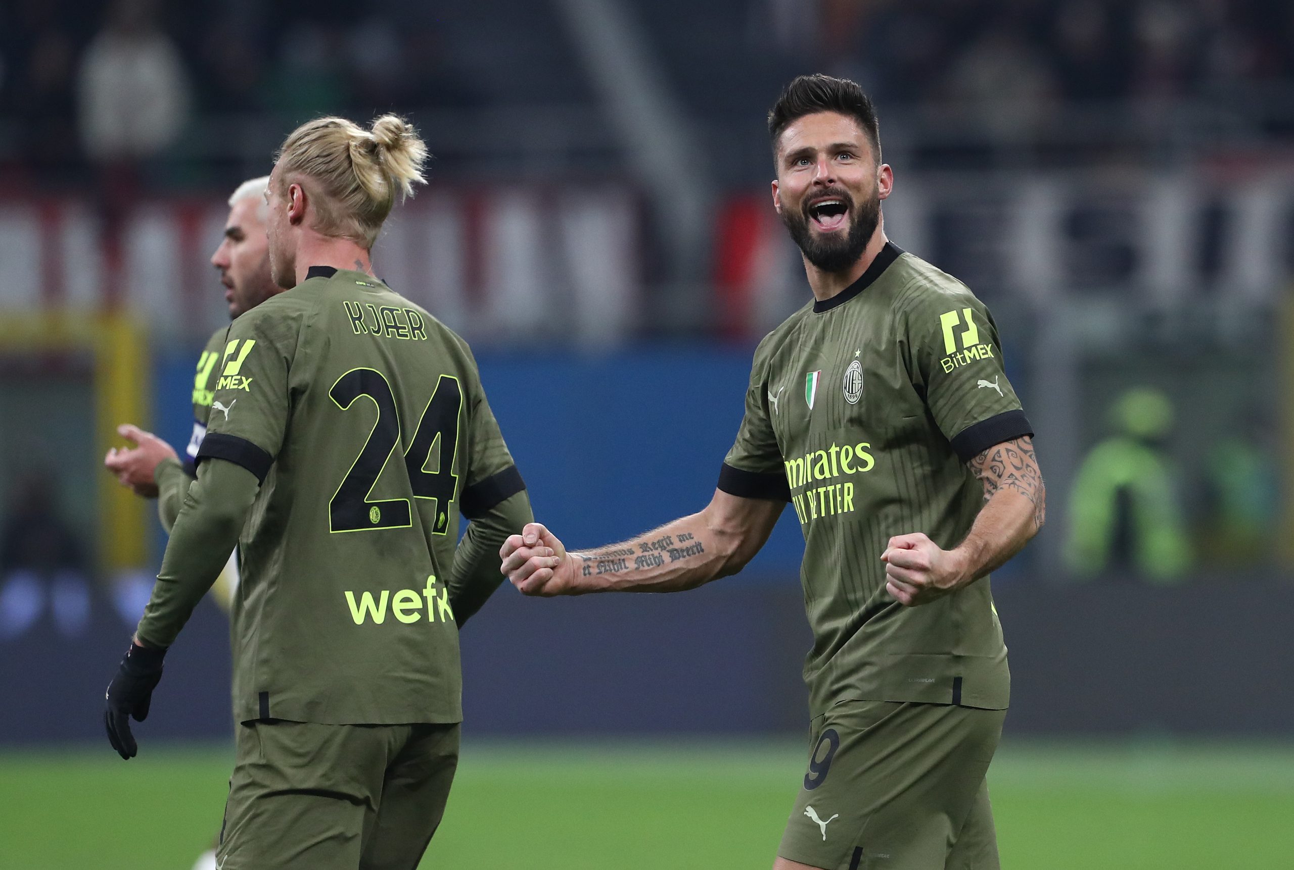 MILAN, ITALY - FEBRUARY 10: Olivier Giroud of AC Milan celebrates scoring his goal during the Serie A match between AC MIlan and Torino FC at Stadio Giuseppe Meazza on February 10, 2023 in Milan, . (Photo by Marco Luzzani/Getty Images)