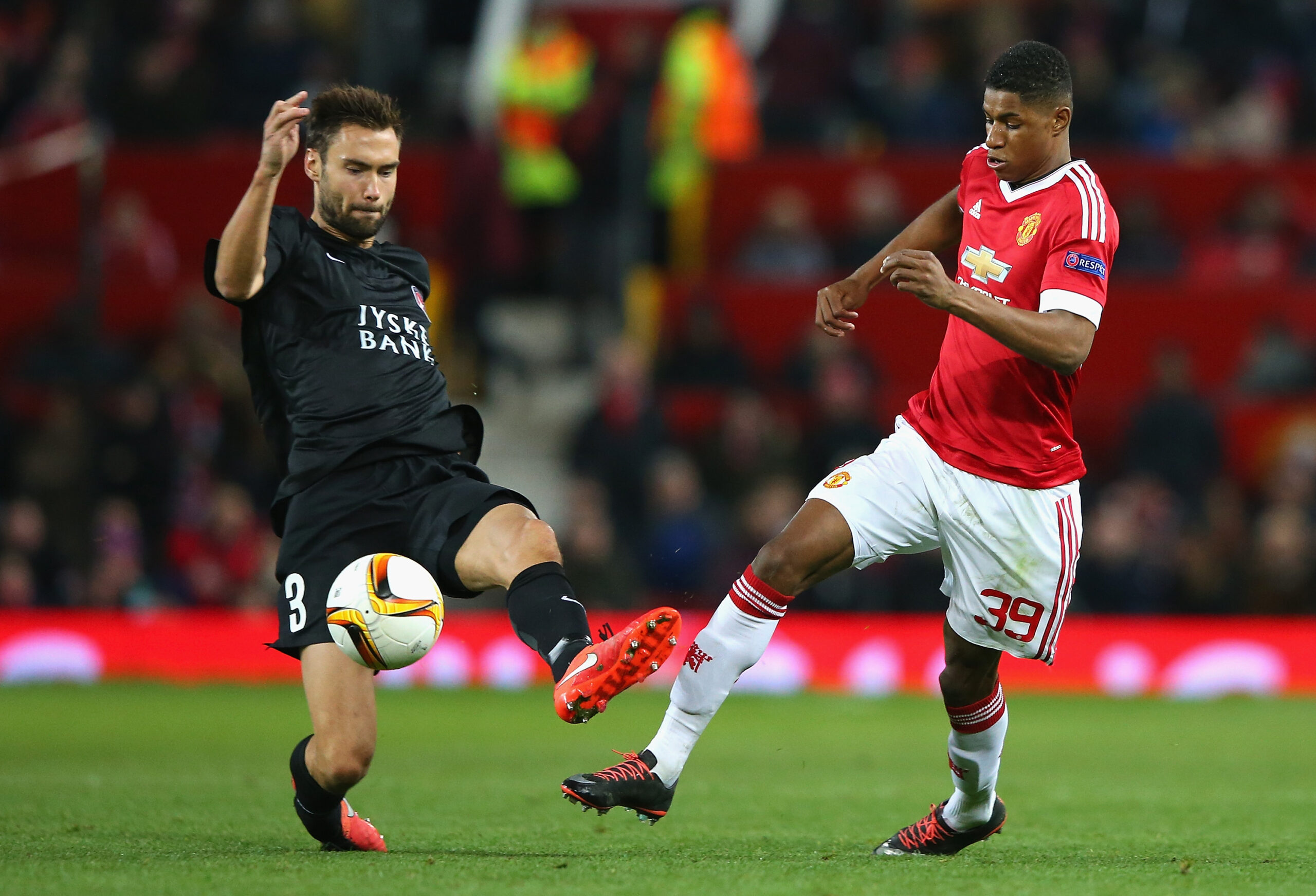 MANCHESTER, ENGLAND - FEBRUARY 25: Marcus Rashford of Manchester United and Tim Sparv of FC Midtjylland compete for the ball during the UEFA Europa League Round of 32 second leg match between Manchester United and FC Midtjylland at Old Trafford on February 25, 2016 in Manchester, United Kingdom. (Photo by Alex Livesey/Getty Images)