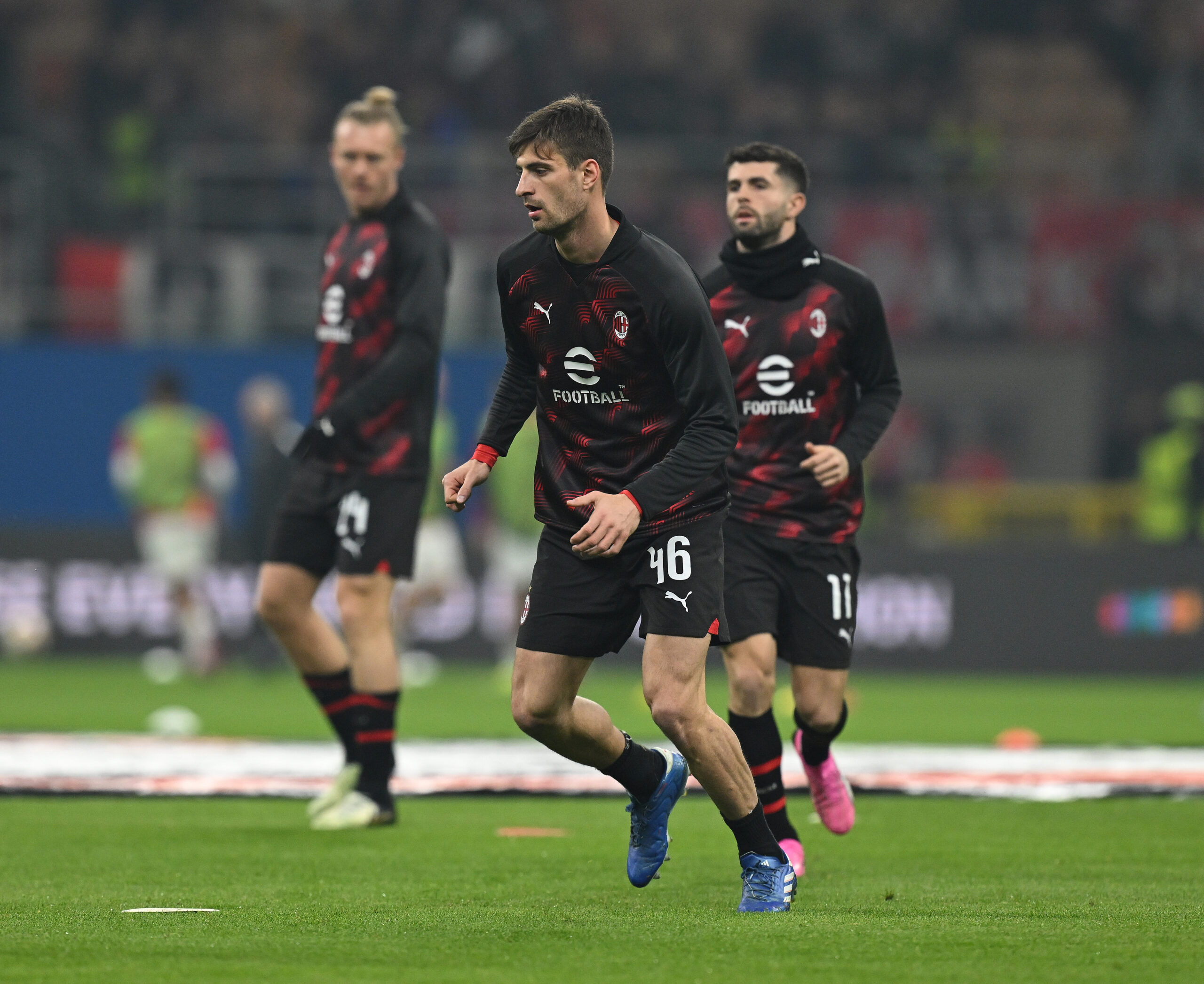 MILAN, ITALY - FEBRUARY 15: Matteo Gabbia of AC Milan warms up ahead of the UEFA Europa League match between AC Milan and Stade Rennais FC at Stadio Giuseppe Meazza on February 15, 2024 in Milan, Italy. (Photo by Claudio Villa/AC Milan via Getty Images)