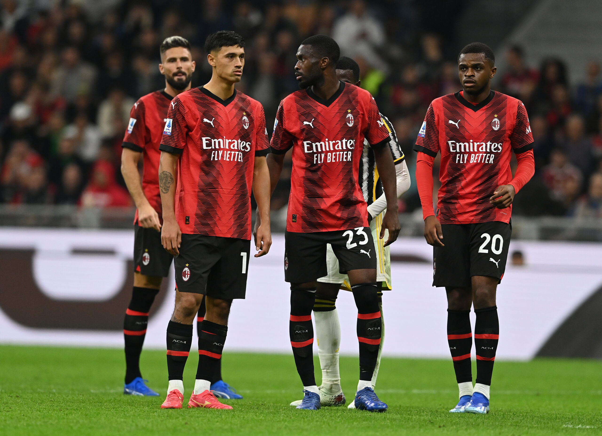 MILAN, ITALY - OCTOBER 22: Players of AC Milan in action during the Serie A TIM match between AC Milan and Juventus at Stadio Giuseppe Meazza on October 22, 2023 in Milan, Italy. (Photo by Claudio Villa/AC Milan via Getty Images)