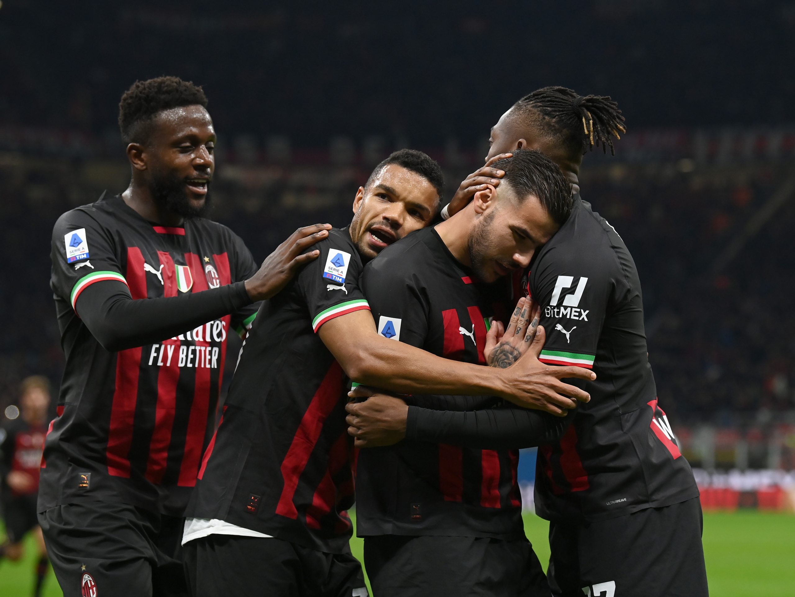MILAN, ITALY - NOVEMBER 05: Theo Hernandez of AC Milan in celebrates with team-mates after scoring the opening goal during the Serie A match between AC MIlan and Spezia Calcio at Stadio Giuseppe Meazza on November 05, 2022 in Milan, Italy. (Photo by Claudio Villa/AC Milan via Getty Images)
