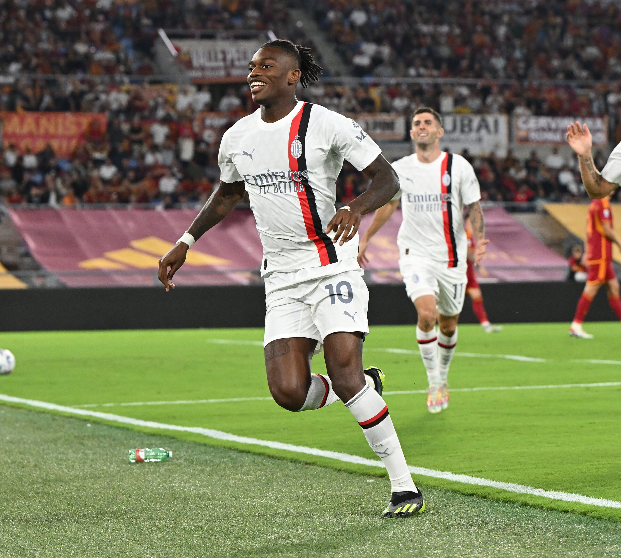 ROME, ITALY - SEPTEMBER 01: Rafael Leao of AC Milan celebrates after scoring the goal during the Serie A TIM match between AS Roma and AC Milan at Stadio Olimpico on September 01, 2023 in Rome, Italy. (Photo by Claudio Villa/AC Milan via Getty Images)