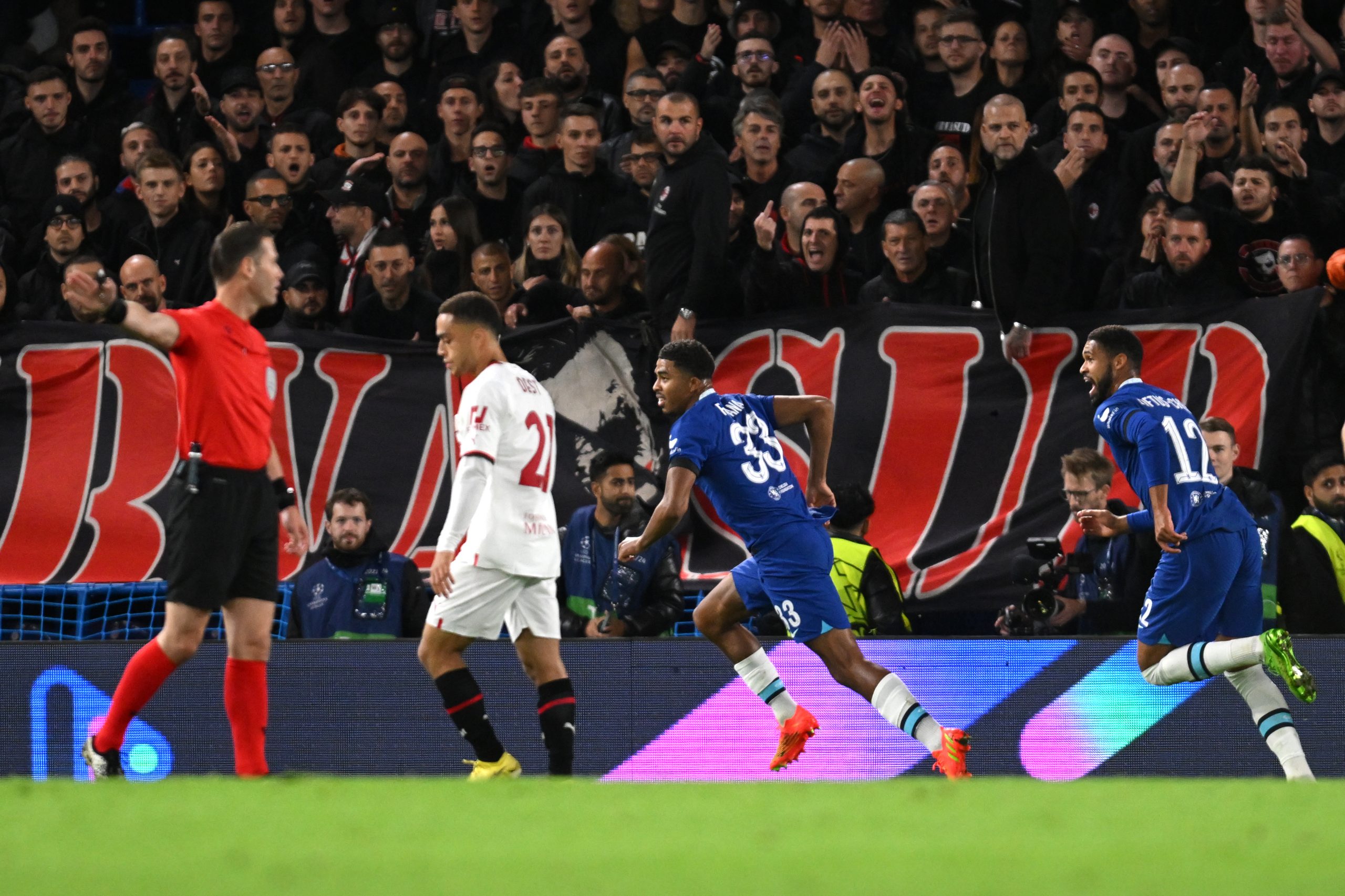 LONDON, ENGLAND - OCTOBER 05: Wesley Fofana of Chelsea celebrates after scoring their sides first goal during the UEFA Champions League group E match between Chelsea FC and AC Milan at Stamford Bridge on October 05, 2022 in London, England. (Photo by Mike Hewitt/Getty Images)