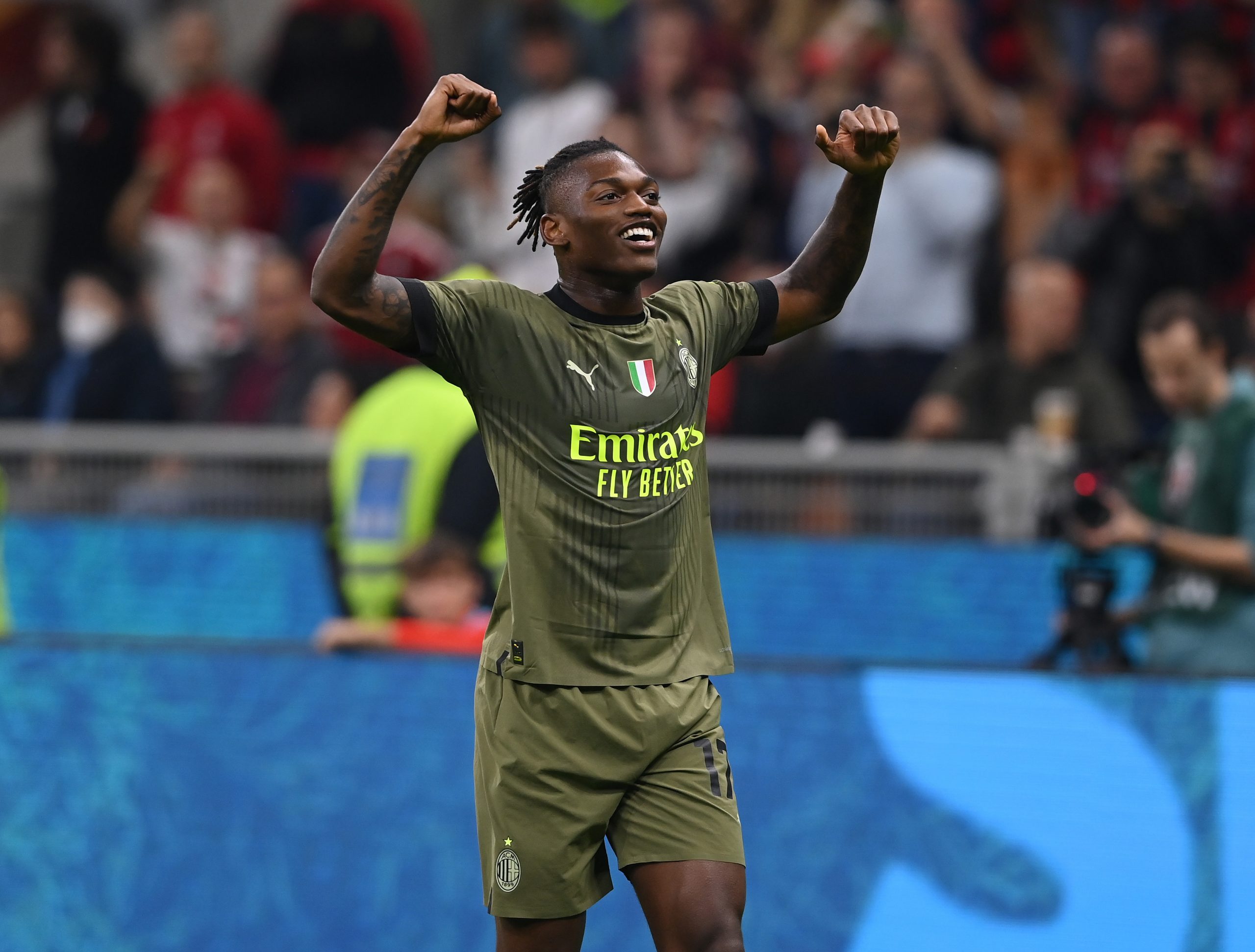 MILAN, ITALY - OCTOBER 22: Rafael Leao of AC Milan celebrates after scoring the goal during the Serie A match between AC Milan and AC Monza at Stadio Giuseppe Meazza on October 22, 2022 in Milan, Italy . (Photo by Claudio Villa/AC Milan via Getty Images)