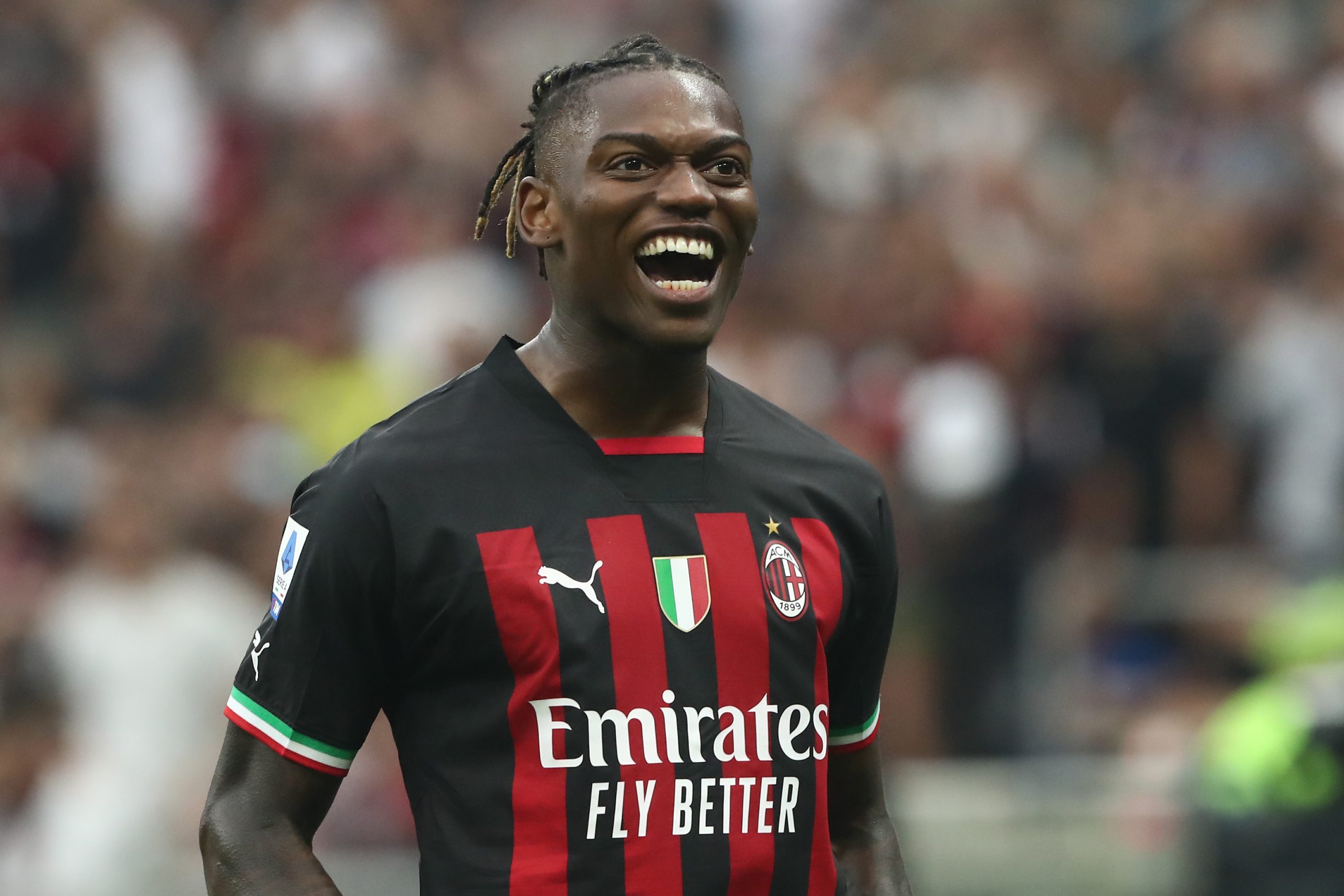 MILAN, ITALY - SEPTEMBER 03: Rafael Leao of AC Milan celebrates scoring their side's third goal during the Serie A match between AC Milan and FC Internazionale at Stadio Giuseppe Meazza on September 03, 2022 in Milan, Italy. (Photo by Marco Luzzani/Getty Images)