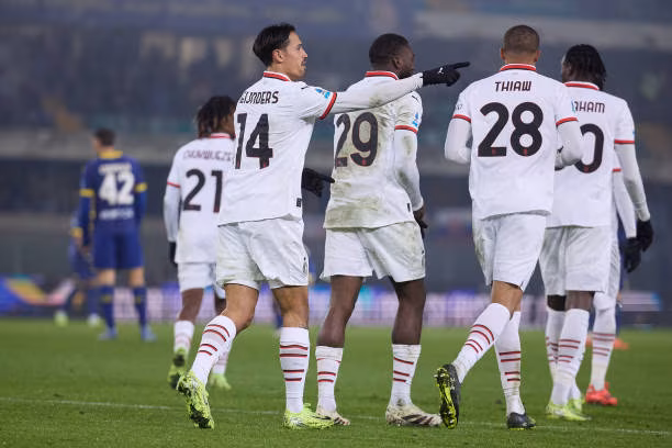 VERONA, ITALY - DECEMBER 20: Tijjani Reijnders of AC Milan celebrates after scoring the opening goal during the Serie A match between Hellas Verona and AC Milan at Stadio Marcantonio Bentegodi on December 20, 2024 in Verona, Italy. (Photo by Emmanuele Ciancaglini/Ciancaphoto Studio/Getty Images)