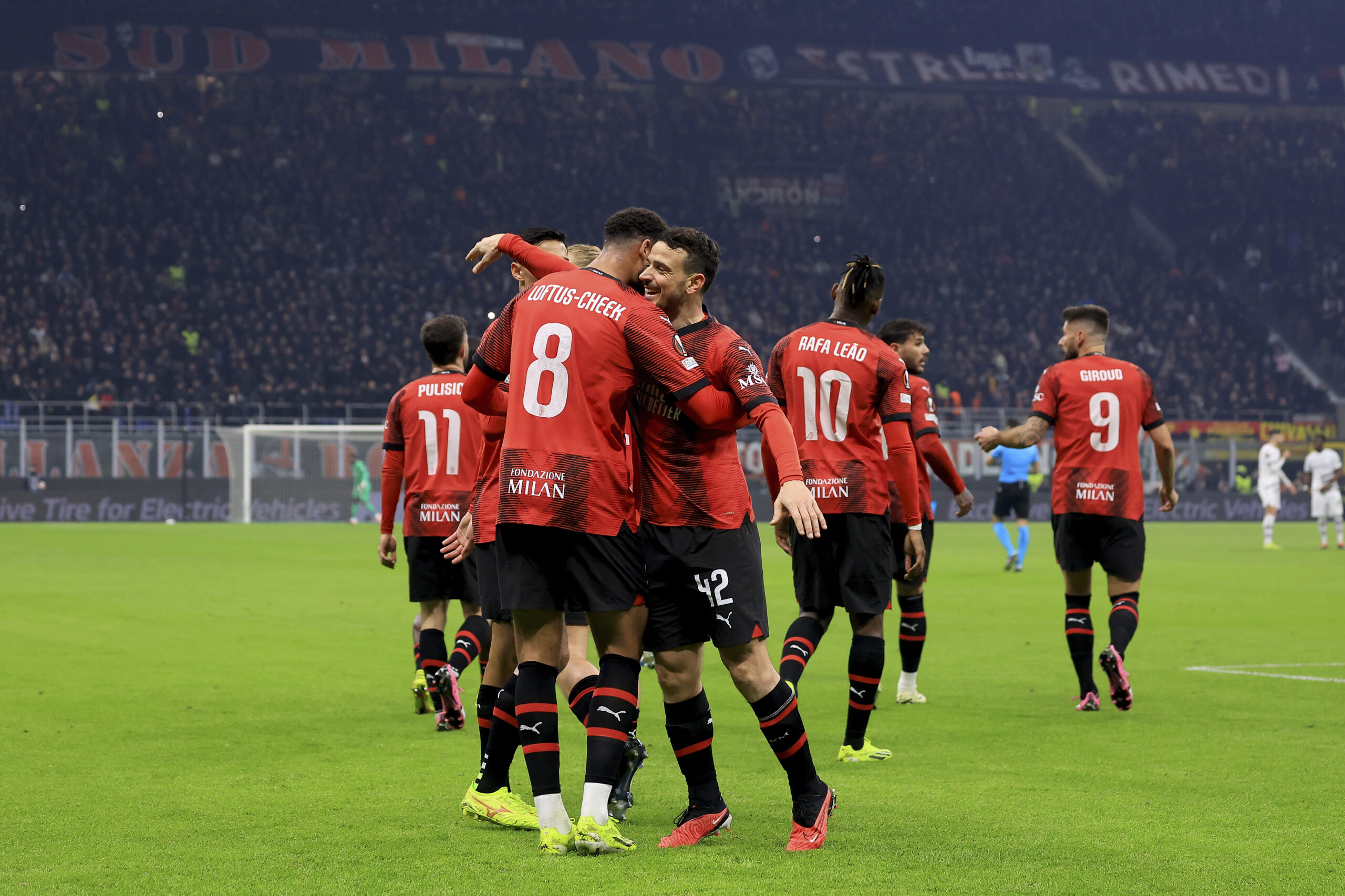 MILAN, ITALY - FEBRUARY 15: Ruben Loftus-Cheek of AC Milan celebrates with Alessandro Florenzi after scoring the his team's first goal during the UEFA Europa League 2023/24 Playoff first leg match between AC Milan and Stade Rennais FC at Stadio Giuseppe Meazza on February 15, 2024 in Milan, Italy. (Photo by Giuseppe Cottini/AC Milan via Getty Images)
