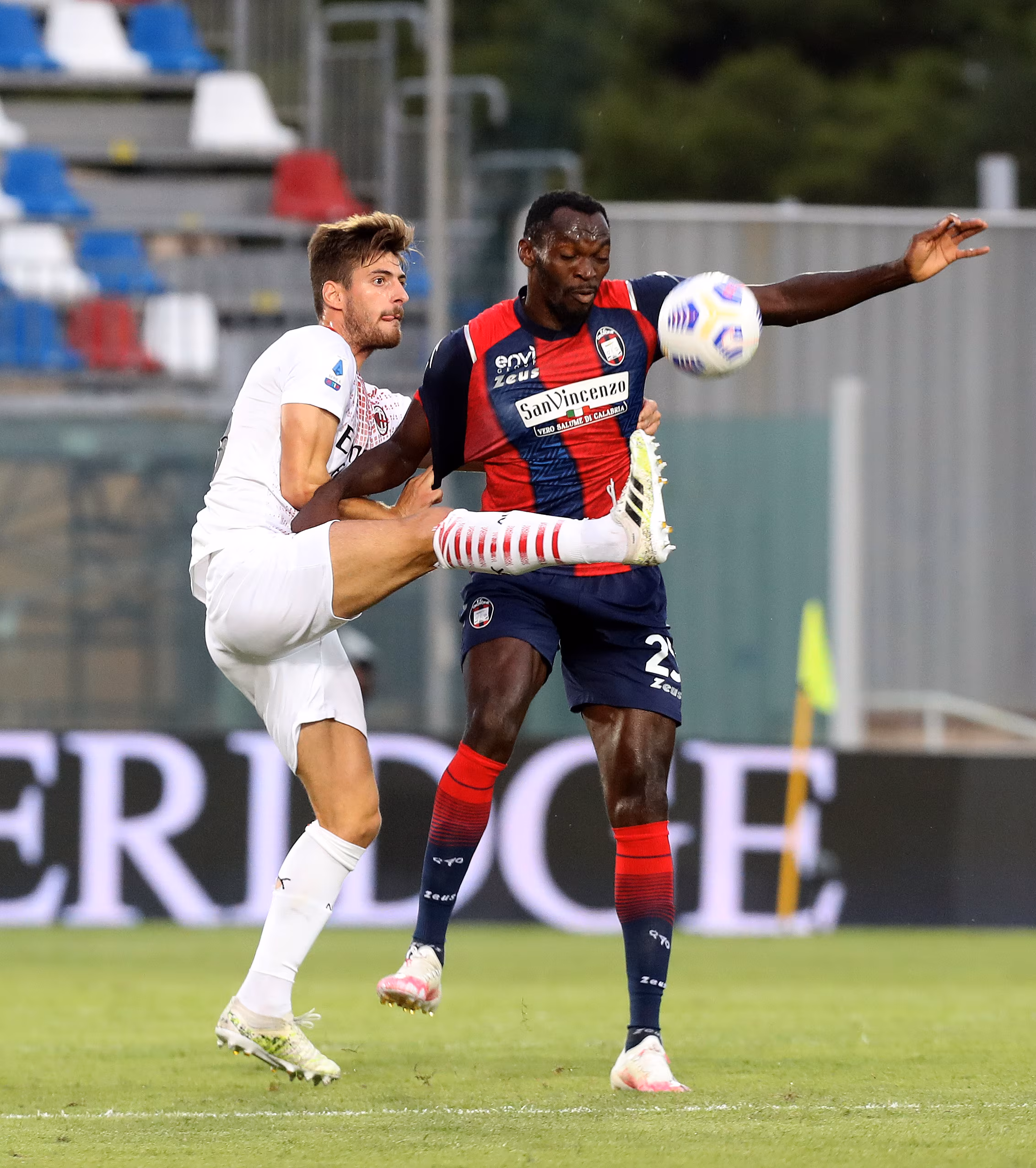 CROTONE, ITALY - SEPTEMBER 27: Nwankwo Simy of Crotone competes for the ball with Matteo Gabbia of Milan during the Serie A match between FC Crotone and AC Milan at Stadio Comunale Ezio Scida on September 27, 2020 in Crotone, Italy. (Photo by Maurizio Lagana/Getty Images)