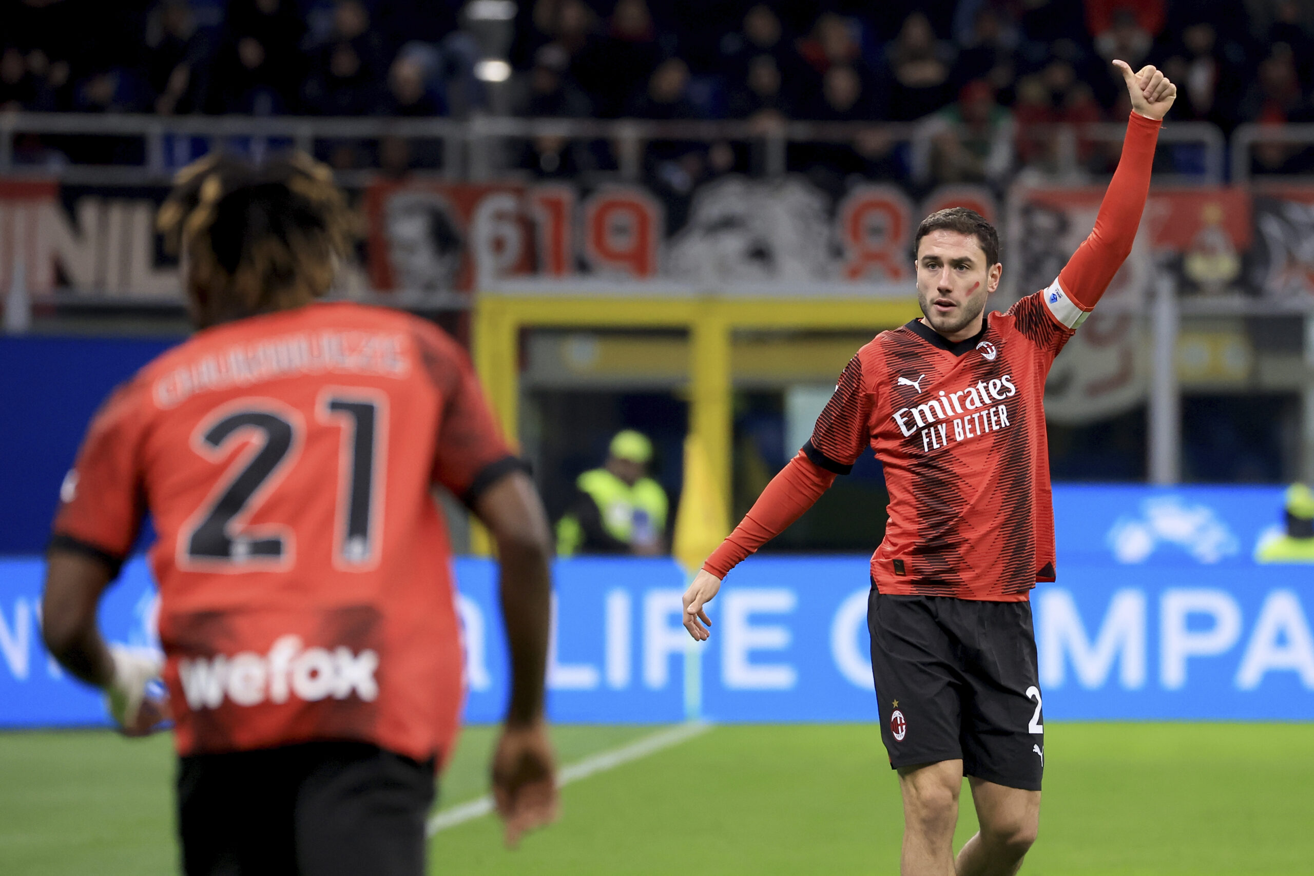 MILAN, ITALY - NOVEMBER 25: Davide Calabria of AC Milan gestures during the Serie A TIM match between AC Milan and ACF Fiorentina at Stadio Giuseppe Meazza on November 25, 2023 in Milan, Italy. (Photo by Giuseppe Cottini/AC Milan via Getty Images )