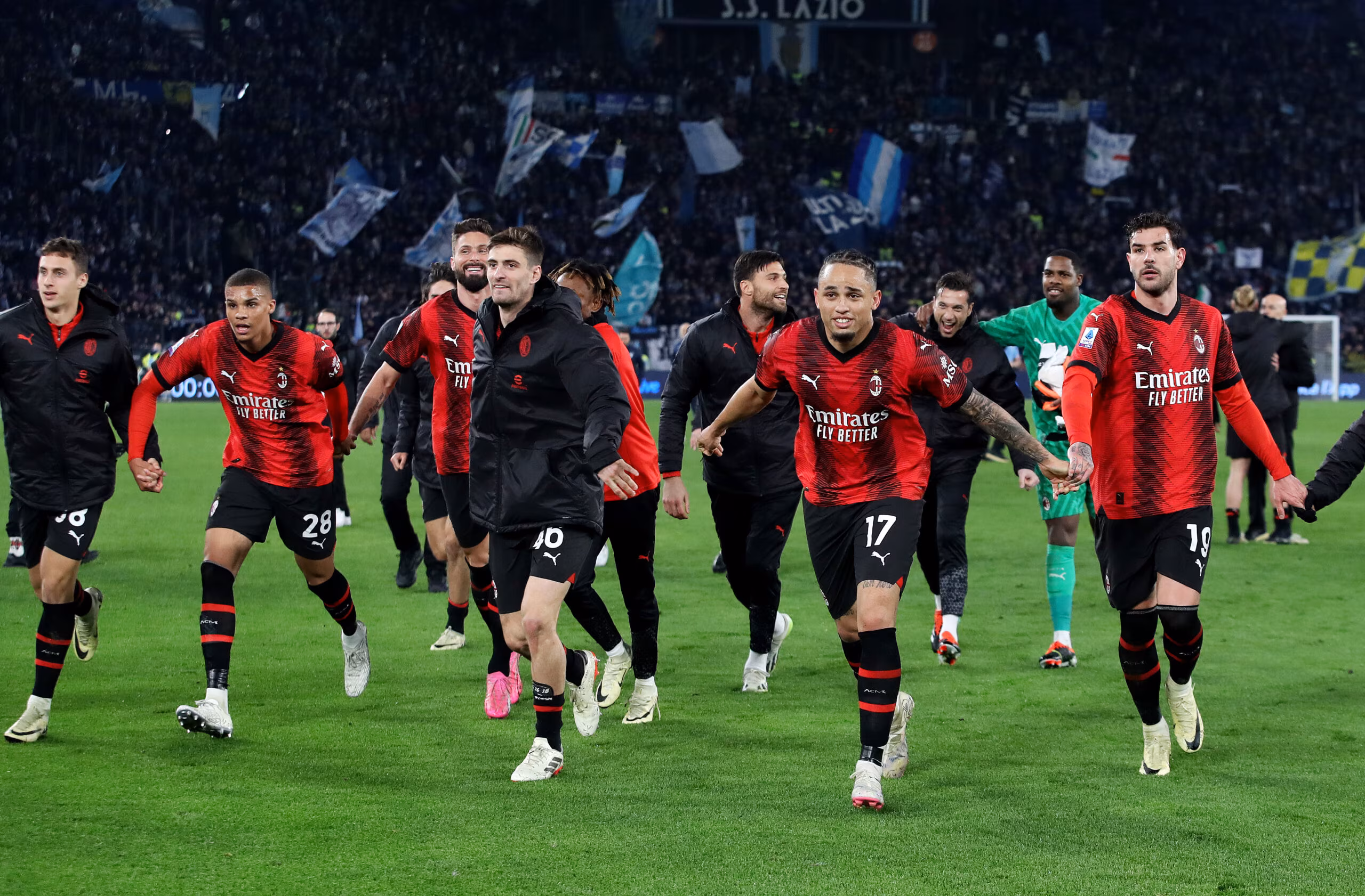 ROME, ITALY - MARCH 01: Noah Okafor of AC Milan celebrates with teammates after defeating SS Lazio as they acknowledge the fans after the Serie A TIM match between SS Lazio and AC Milan - Serie A TIM at Stadio Olimpico on March 01, 2024 in Rome, Italy. (Photo by Paolo Bruno/Getty Images)