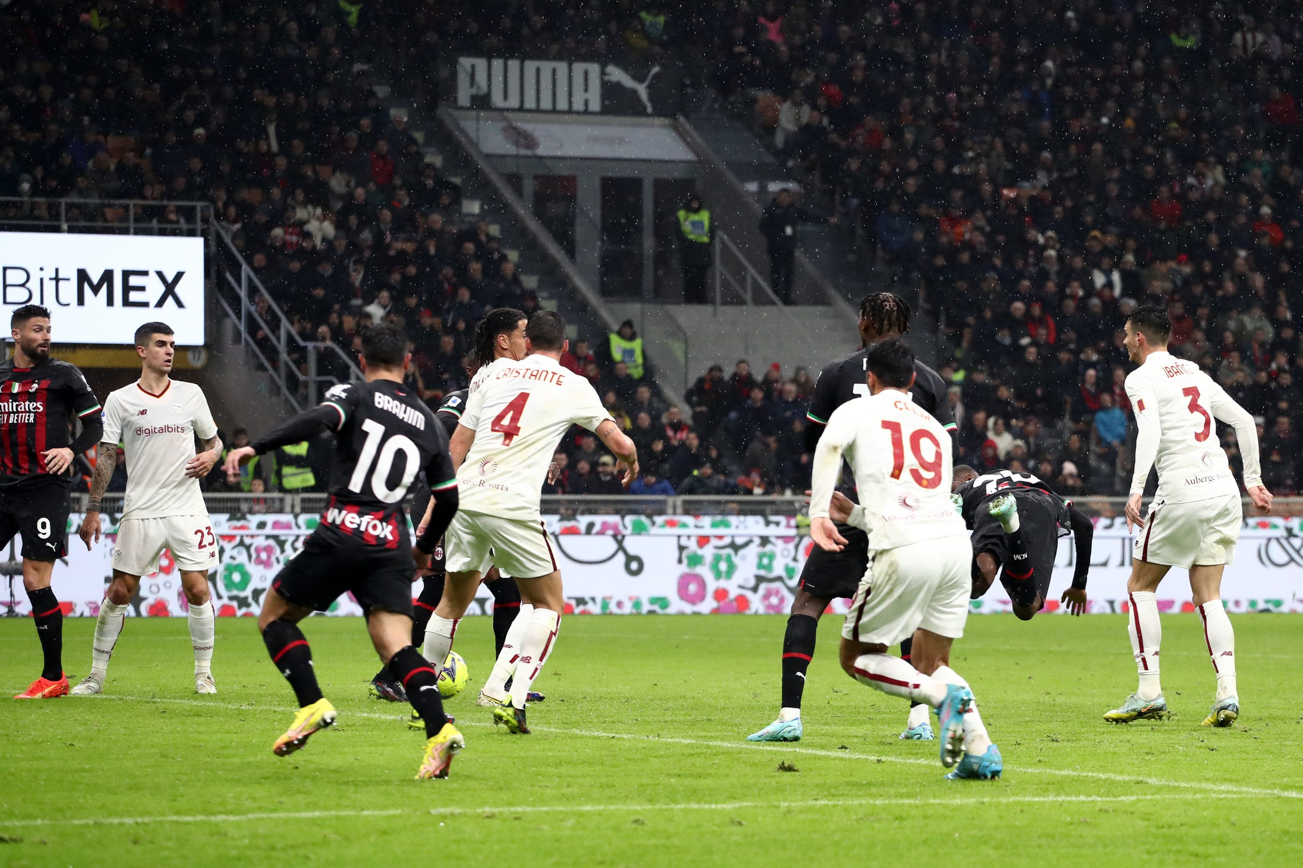 MILAN, ITALY - JANUARY 08: Pierre Kalulu of AC Milan scores the team's first goal during the Serie A match between AC Milan and AS Roma at Stadio Giuseppe Meazza on January 08, 2023 in Milan, Italy. (Photo by Marco Luzzani/Getty Images)