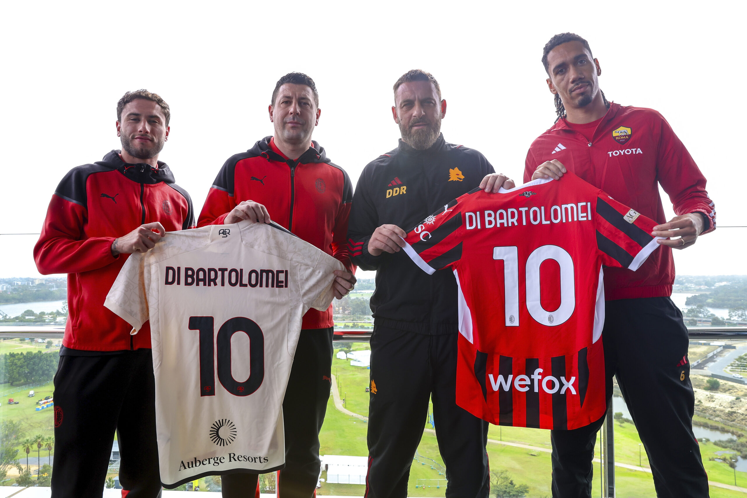 PERTH, AUSTRALIA - MAY 29: Davide Calabria of AC Milan, Daniele Bonera Head coach of AC Milan, Daniele De Rossi Head coach AS Roma and Chris Smalling pose with the jersey of former player Agostino Di Bartolomei after the press conference to present the friendly match between AS Roma and AC Milan at Crown Towers on May 29, 2024 in Perth, Australia. (Photo by Giuseppe Cottini/AC Milan via Getty Images)