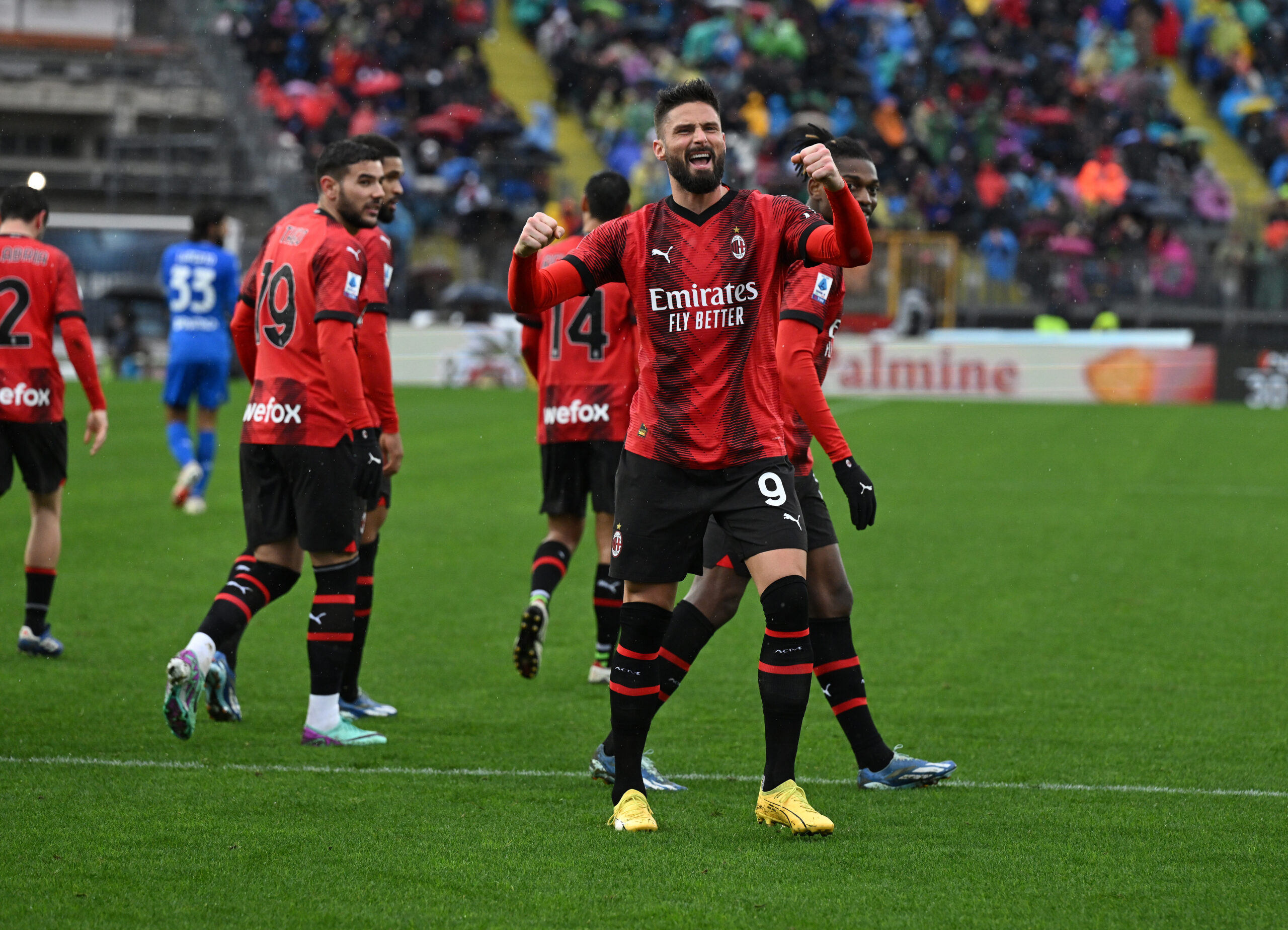 EMPOLI, ITALY - JANUARY 07: Olivier Giroud of AC Milan celebrates with team-mates after scoring the goal during the Serie A TIM match between Empoli FC and AC Milan at Stadio Carlo Castellani on January 07, 2024 in Empoli, Italy. (Photo by Claudio Villa/AC Milan via Getty Images)